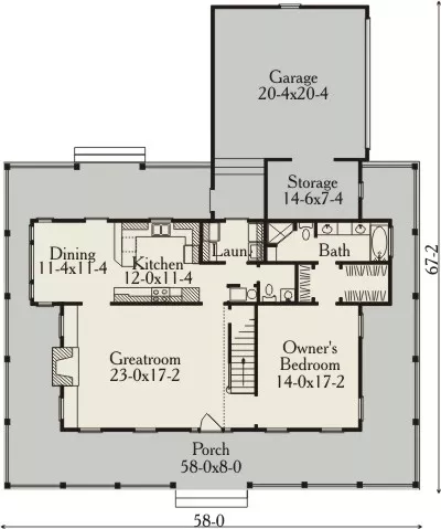 The wrap around porch is responsible for the popularity of this design. Windows flank each side of the great room fireplace with built-in cabinets below. The upper floor includes two large bedrooms and a shared bath.