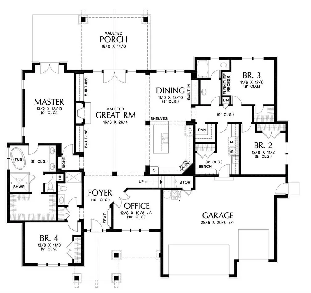 Stone accents and prominent columns lend a Craftsman feel to this beautiful house plan, with four bedrooms, four baths and a luxurious 3,340 square feet of living space. Relax in the vaulted great room of this home plan, in front of a crackling fire. Expand any party to the rear porch. The family chef will appreciate the open kitchen, with its nearby pantry. Serve any meal in the dining room, where built-in shelves are a nice touch. Retire to the master bedroom at day's end; open the French doors to do some stargazing. The personal bath boasts a garden tub, a tile shower and dual sinks. Don't overlook the sizable walk-in closet. Three more bedrooms in this home design enjoy nearby baths. Do some reading and reflection in the quiet office. Our customers love the upstairs area for games and fun.