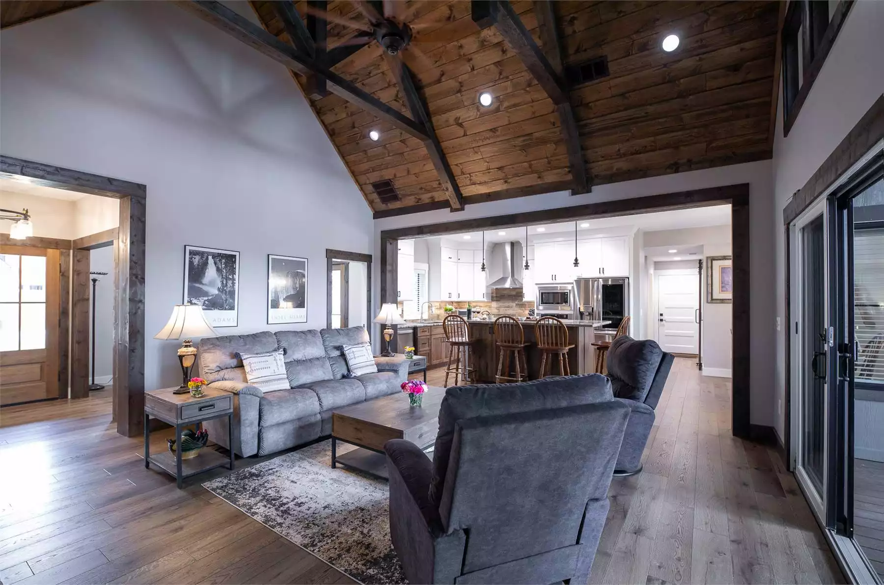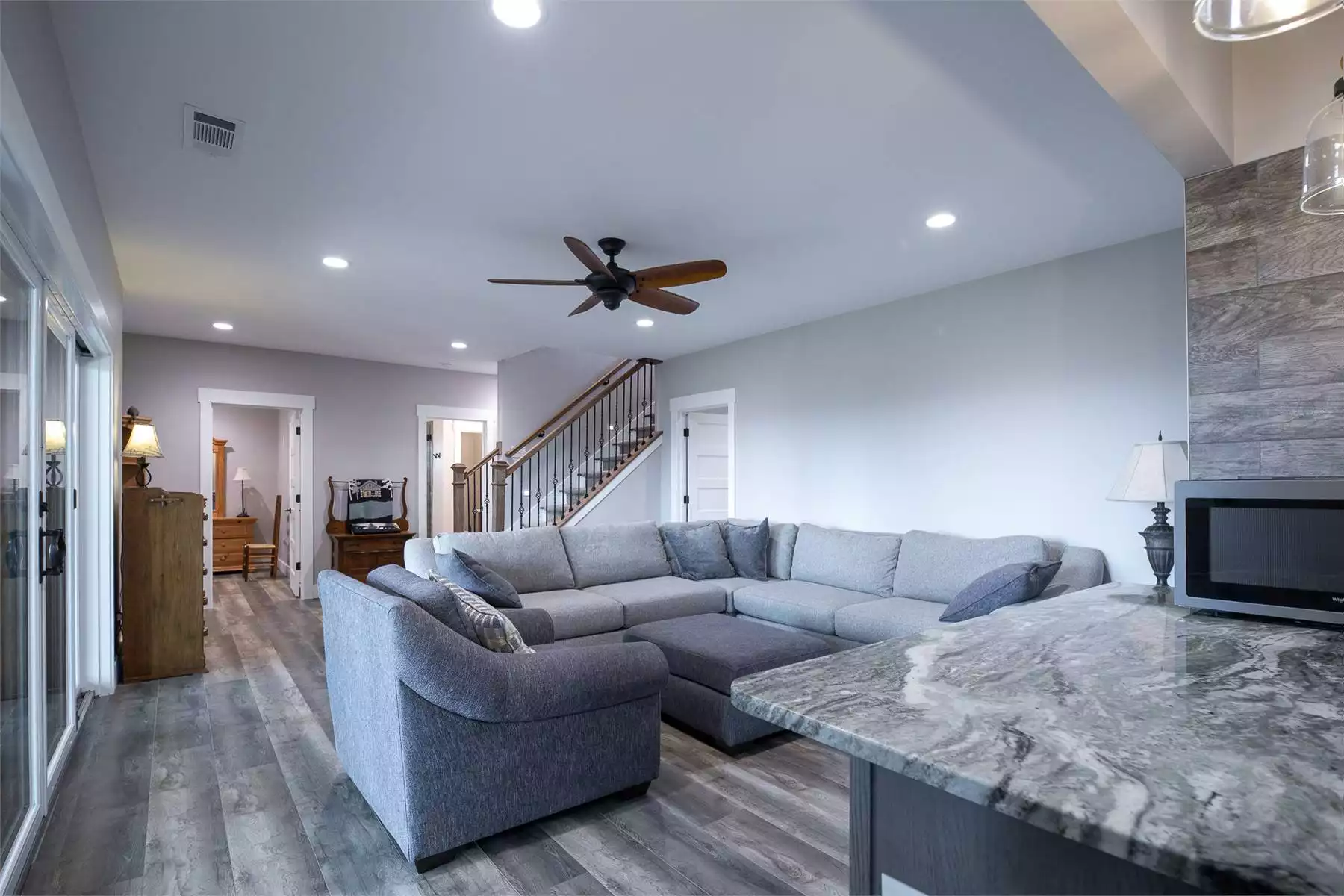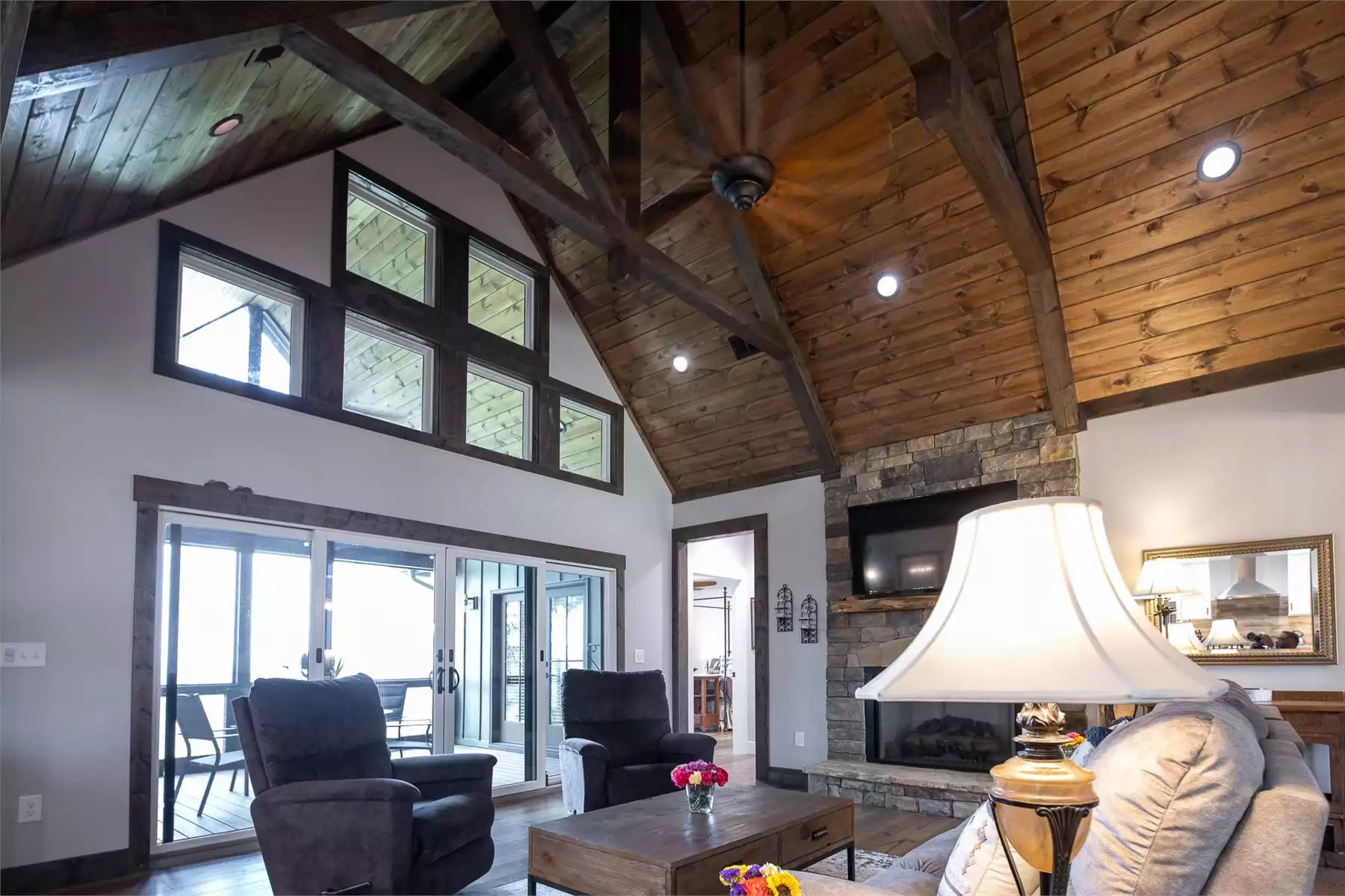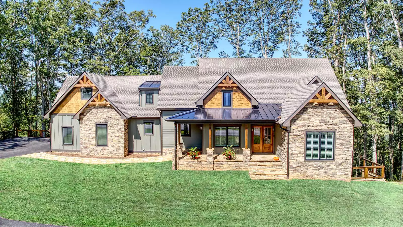 Beautiful Mountain Cottage with Wood and Stone Facade View Interior & Exterior Customer Built New Home Tour! Front View Side-Entry Garage Featuring Clopay® Garage Doors Right Side View with Hardie® Panel Siding Double Rear Decks Offer Lots of Entertainment Possibilities Aerial View Showing GAF® Shingles Front Entry with Wood and Stone Features Foyer Seen from Family Room Large Windows for Views in Family Room Family Room with Trussed Vaulted Ceiling Family Room Open to Kitchen Family Room Family Room Kitchen with Island Seating & Pendant Lighting Kitchen Island Overlooking Family Room Kitchen with Sink Overlooking Front Yard Kitchen Open to Sunny Dining Nook Kitchen Cooking Area Featuring Whirlpool® Range Hood Whirlpool® Microwave Installed with Built-in Trim Kit Dining Nook with Rear Views Dining and Kitchen Hallway to Garage and Stairs to Bonus Space Vaulted Lanai with Transom Windows & Corner Fireplace Lanai with Wood Paneled Ceiling & Expansive Rear Views Lanai View from Primary Bedroom Featuring Therma-Tru® Doors Primary Bedroom with Stepped Ceiling Barn Doors Open to Private & Luxurious Ensuite Primary Bath Primary Bath with View into Walk-In Closet Primary Bath with View into Primary Bedroom Primary Bath Vanity with Makeup Counter Primary Shower Featuring Wood-Look Tile & Delta® Fixtures Primary Den Beside Foyer Primary Den Work & Lounge Space Primary Den View of Front Yard Music Room by Foyer Music Room with Access to Front Porch & Family Room Music Room Seen Through Porch Door Entryway Stairway to Lower Level Finished Basement Finished Basement with Lots of Natural Light Walkout Basement Family Room Walkout Basement Opens into Outdoor Living Lower-Level Deck with Main-Level Lanai Above Walkout Basement Family Room Looking Toward Kitchen Lower-Level Kitchen Featuring Whirlpool® Appliances Lower-Level Kitchen with Ample Counterspace Lower-Level Dining or Game Area Bedroom Suite Located on Lower Level Bedroom Suite Located on Lower Level Basement Jack & Jill Bath with Additional Hall Access Second Basement Bedroom Suite Second Basement Bedroom Suite Basement Exercise Room Bonus Room Above Garage Flexible Bonus Room Used as Guest & Office Space Bonus Room with Unique Ceiling & Gable Windows Bonus Room Bathroom Front Rendering 1st Floor Basement Plan Bonus Plan