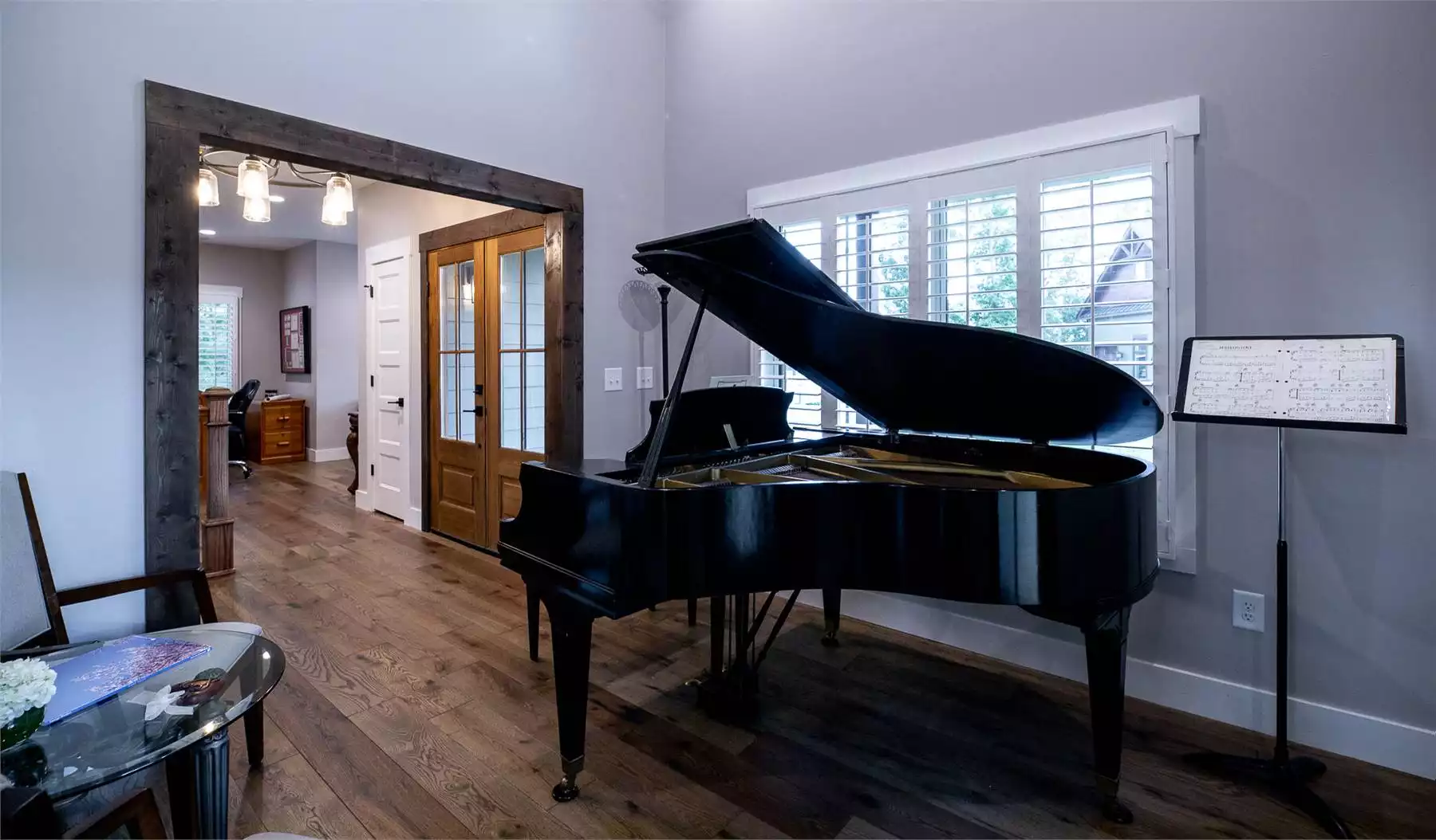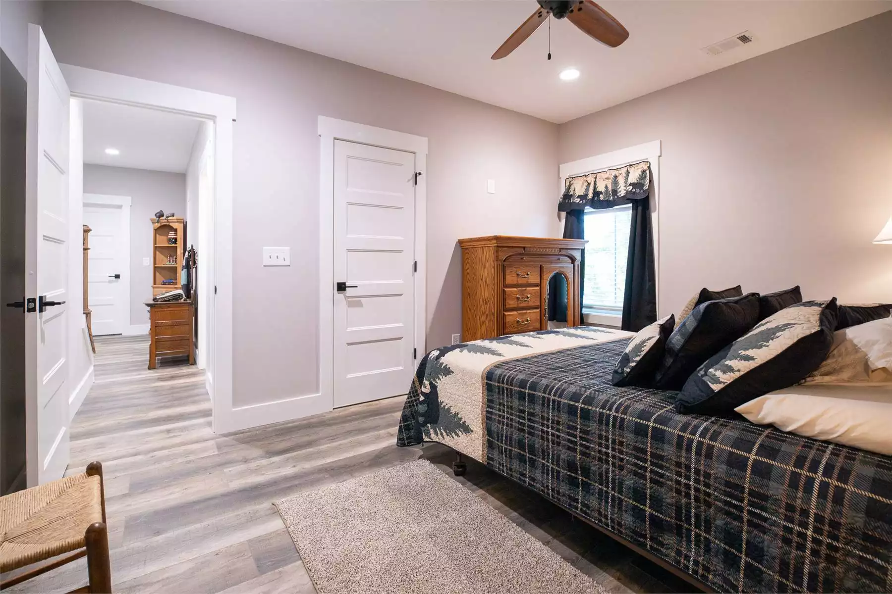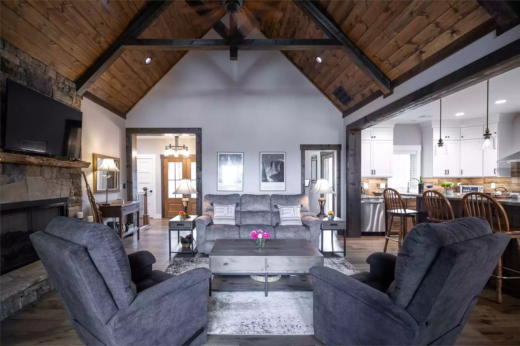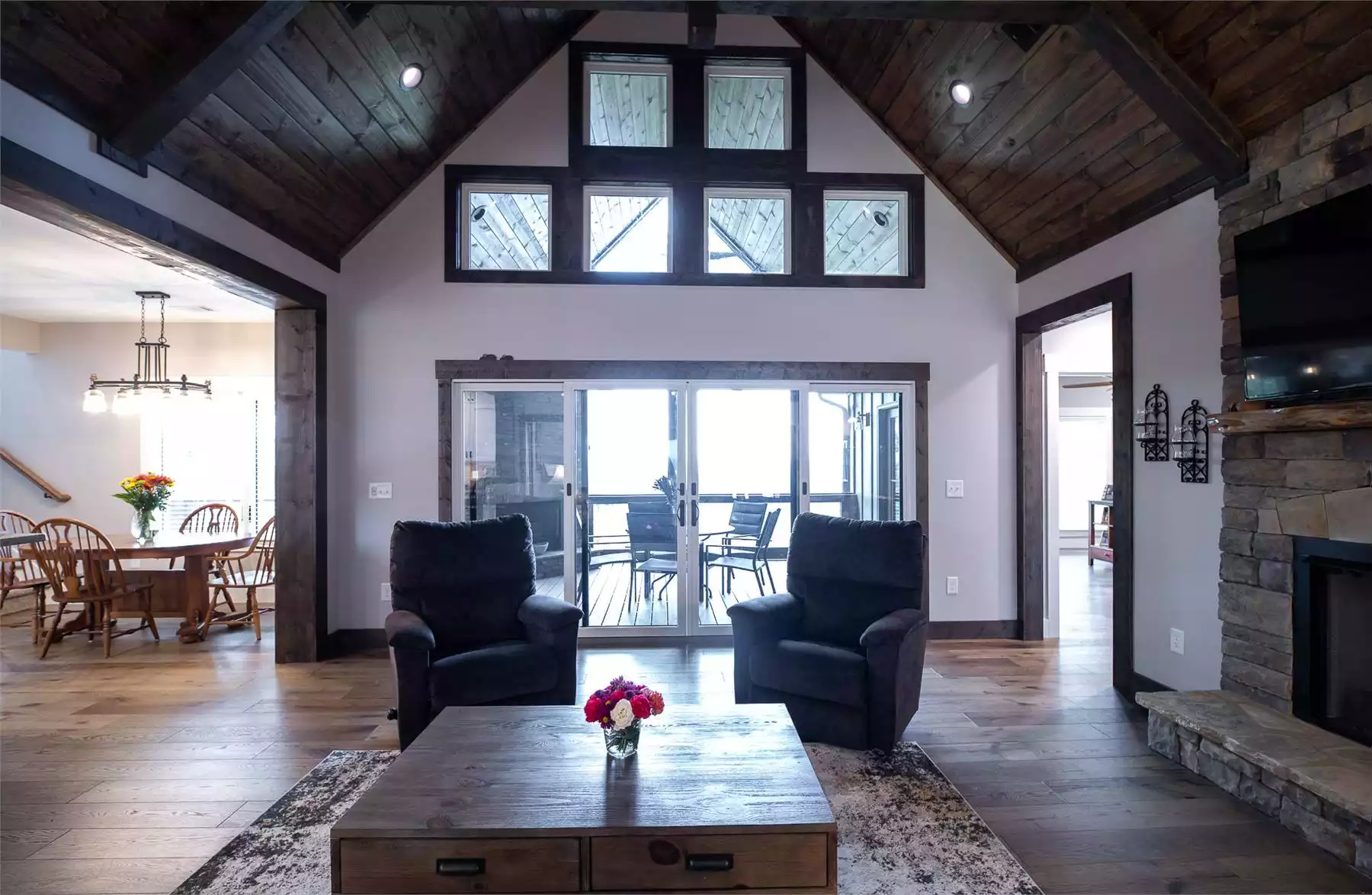 Beautiful Mountain Cottage with Wood and Stone Facade View Interior & Exterior Customer Built New Home Tour! Front View Side-Entry Garage Featuring Clopay® Garage Doors Right Side View with Hardie® Panel Siding Double Rear Decks Offer Lots of Entertainment Possibilities Aerial View Showing GAF® Shingles Front Entry with Wood and Stone Features Foyer Seen from Family Room Large Windows for Views in Family Room Family Room with Trussed Vaulted Ceiling Family Room Open to Kitchen Family Room Family Room Kitchen with Island Seating & Pendant Lighting Kitchen Island Overlooking Family Room Kitchen with Sink Overlooking Front Yard Kitchen Open to Sunny Dining Nook Kitchen Cooking Area Featuring Whirlpool® Range Hood Whirlpool® Microwave Installed with Built-in Trim Kit Dining Nook with Rear Views Dining and Kitchen Hallway to Garage and Stairs to Bonus Space Vaulted Lanai with Transom Windows & Corner Fireplace Lanai with Wood Paneled Ceiling & Expansive Rear Views Lanai View from Primary Bedroom Featuring Therma-Tru® Doors Primary Bedroom with Stepped Ceiling Barn Doors Open to Private & Luxurious Ensuite Primary Bath Primary Bath with View into Walk-In Closet Primary Bath with View into Primary Bedroom Primary Bath Vanity with Makeup Counter Primary Shower Featuring Wood-Look Tile & Delta® Fixtures Primary Den Beside Foyer Primary Den Work & Lounge Space Primary Den View of Front Yard Music Room by Foyer Music Room with Access to Front Porch & Family Room Music Room Seen Through Porch Door Entryway Stairway to Lower Level Finished Basement Finished Basement with Lots of Natural Light Walkout Basement Family Room Walkout Basement Opens into Outdoor Living Lower-Level Deck with Main-Level Lanai Above Walkout Basement Family Room Looking Toward Kitchen Lower-Level Kitchen Featuring Whirlpool® Appliances Lower-Level Kitchen with Ample Counterspace Lower-Level Dining or Game Area Bedroom Suite Located on Lower Level Bedroom Suite Located on Lower Level Basement Jack & Jill Bath with Additional Hall Access Second Basement Bedroom Suite Second Basement Bedroom Suite Basement Exercise Room Bonus Room Above Garage Flexible Bonus Room Used as Guest & Office Space Bonus Room with Unique Ceiling & Gable Windows Bonus Room Bathroom Front Rendering 1st Floor Basement Plan Bonus Plan