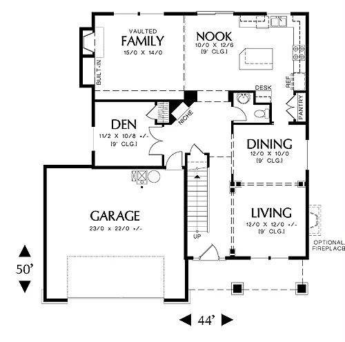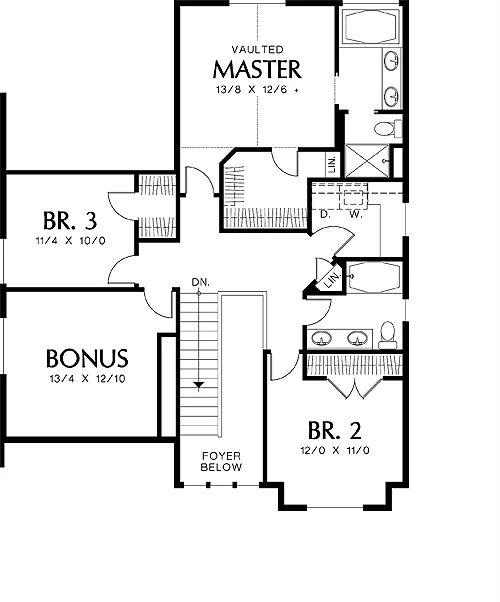 The interior is purely delightful and offers up formal living spaces at the very front of the plan in living and dining rooms defined by columns. The family room is at the back and has a vaulted ceiling, fireplace and built-in entertainment center. A breakfast nook makes the perfect spot for casual meals served from the island kitchen. A den, with closet, sits on the left side of the plan, opening through double doors.