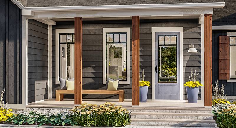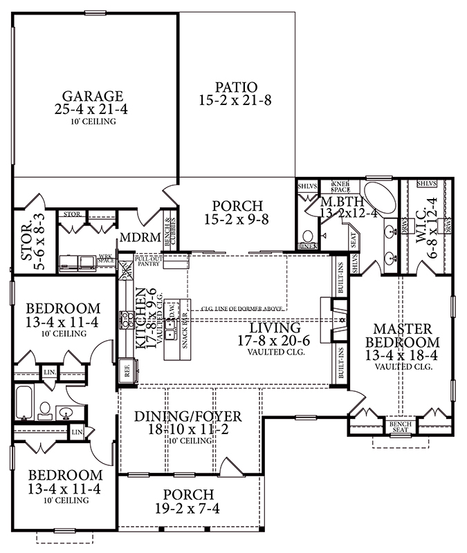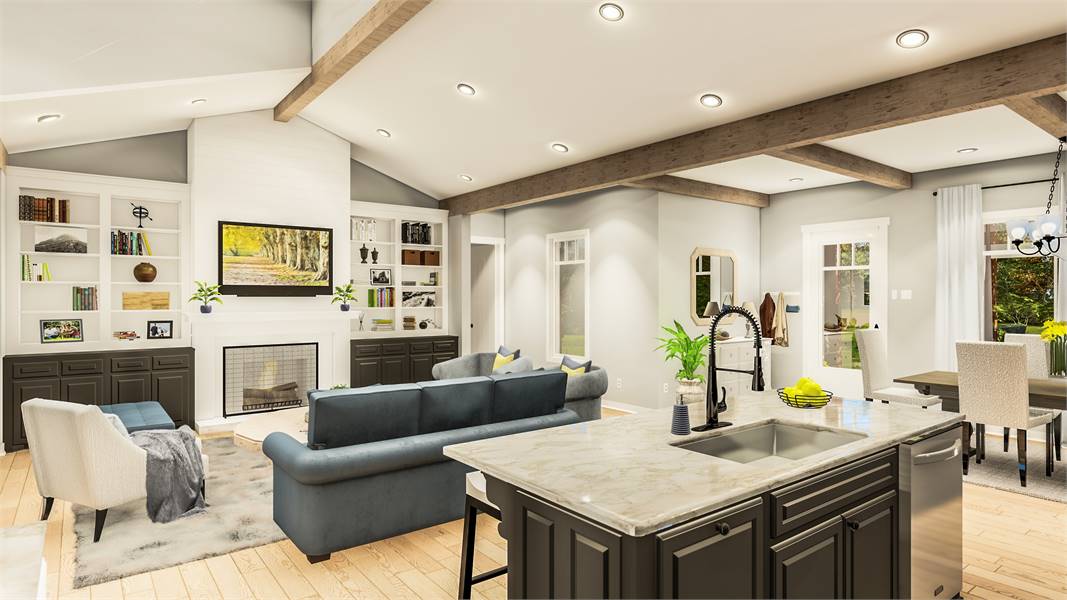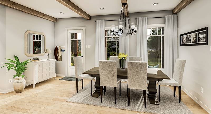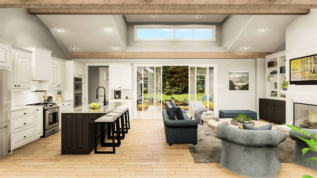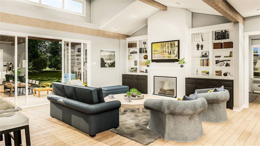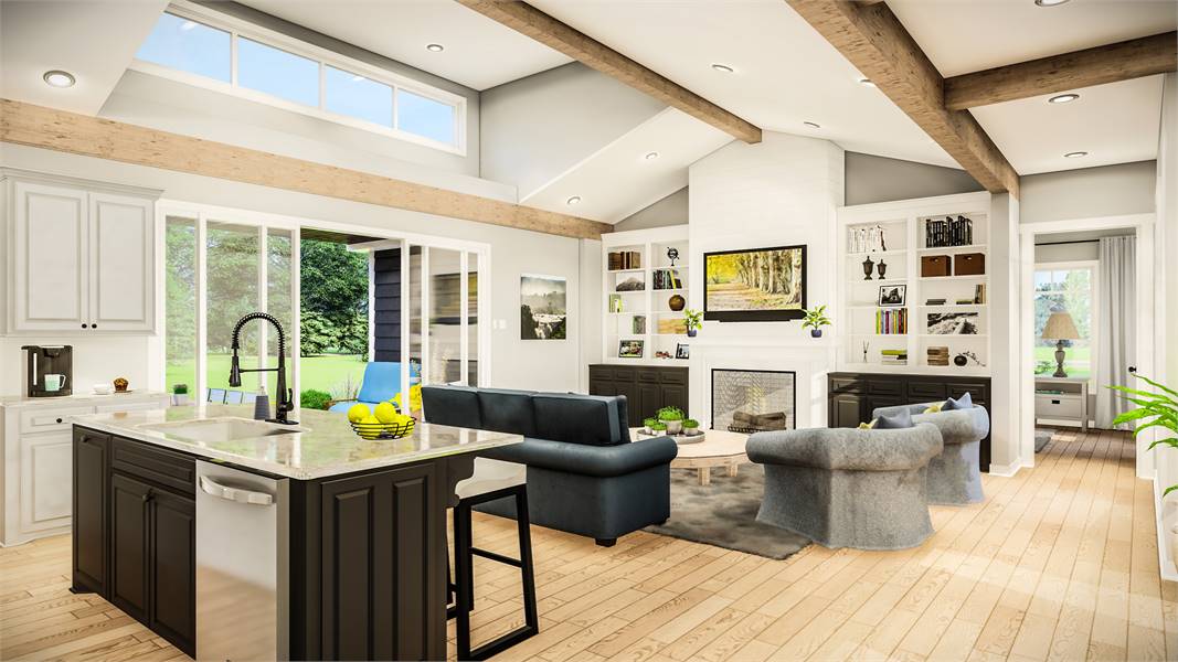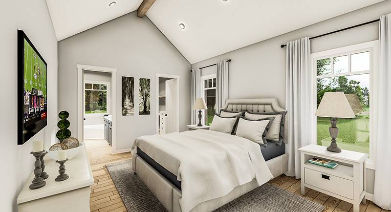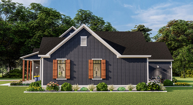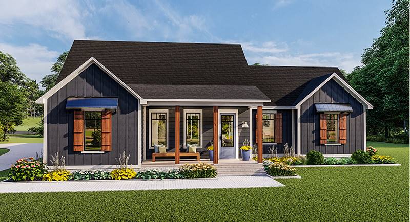 This modern farmhouse plan and its newer version, House Plan 8659, are defined by sleek lines and a simple design aesthetic. Offering 1,936 square feet of living space, this 3 bedroom, 2 bathroom home is a wonderful plan for the home buyer or family who values affordability and style. A single-story layout and an open concept design make this home feel much more open and larger than it already is. A chic façade offers some unique curb appeal, while the covered front porch and entryway puts you immediately into the foyer and formal dining room. Much of this house has 10’ ceilings the whole way around, making the rooms feel grander and the space feel larger. To the left of the foyer is a small hallway and 2 bedrooms and a shared full bath. This space is secluded enough to make it a great option for kids or guests, or even a home office if necessary. Back to the main spaces of the home, past the dining room is an open country kitchen and island which flow directly into the living room. This thoughtful design allows the space to feel vast yet inclusive, great for entertaining or family get-togethers. Sliding glass doors off of the living room open onto the back porch and patio which are perfect for enhanced outdoor living.  Finally, the master suite can be found on the far right-hand side of the home. A relaxing and luxurious space, the bedroom features vaulted ceilings and a spacious walk-in closet, as well as a large bathroom and spa tub, as well as a custom-built shower. As an added bonus, this home provides a 2-car rear garage, great for storage and easy access. This plan’s reduced footprint makes it wonderful for a narrow or limited lot.