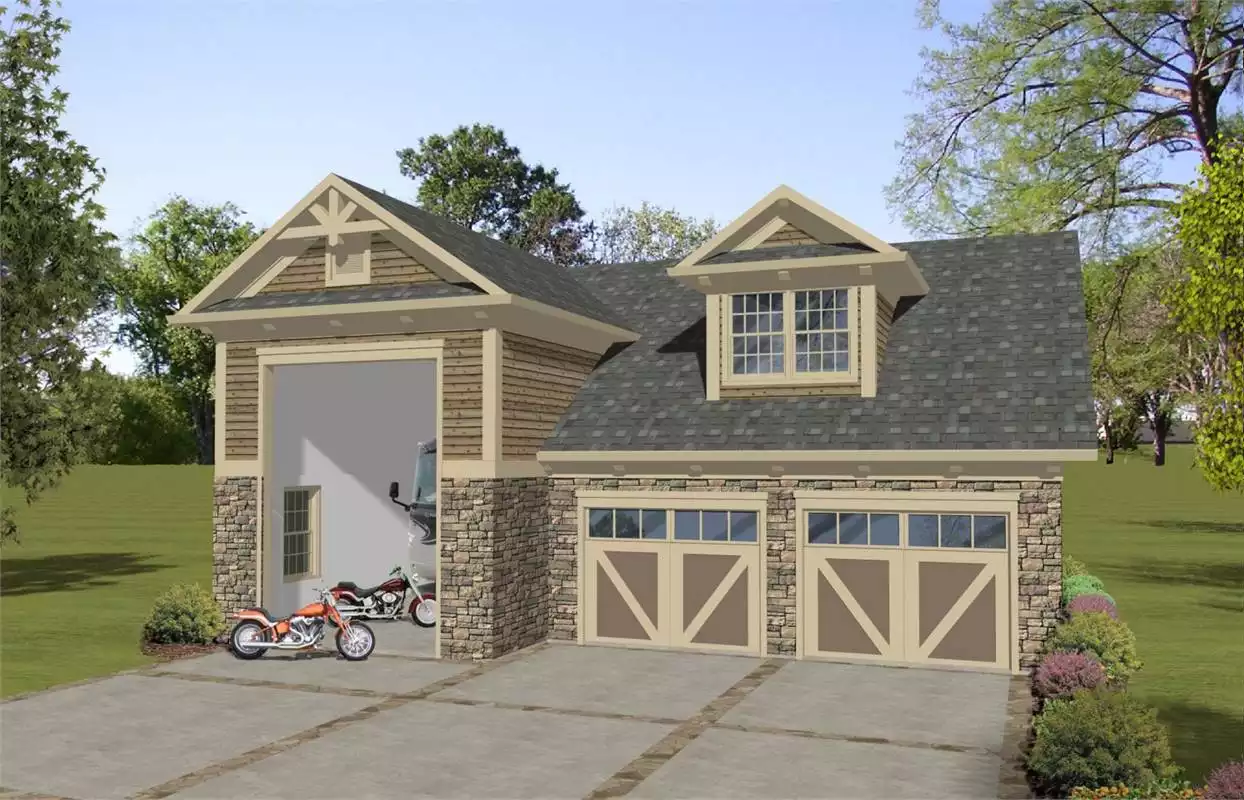This wonderful, 870 square foot Craftsman style plan is your best choice for a vacation home providing everything you could possibly need.  Featuring a 2-car garage for your cars or large toys, it also includes an RV garage with a 14' overhead door and 16' ceilings to allow the largest Class A RV to fit.  This beautiful plan boasts a large all-in-one Living area and kitchen.  A washer/dryer is tucked away under the stairs making doing the laundry convenient.  There is a large bedroom suite with sitting area and spacious bathroom perfect for your vacation needs.  Two walk-in closets brings storage for two.   This garage plan has everything you may need for comfort and would be a wonderful home away from home destination at the end of your travels.