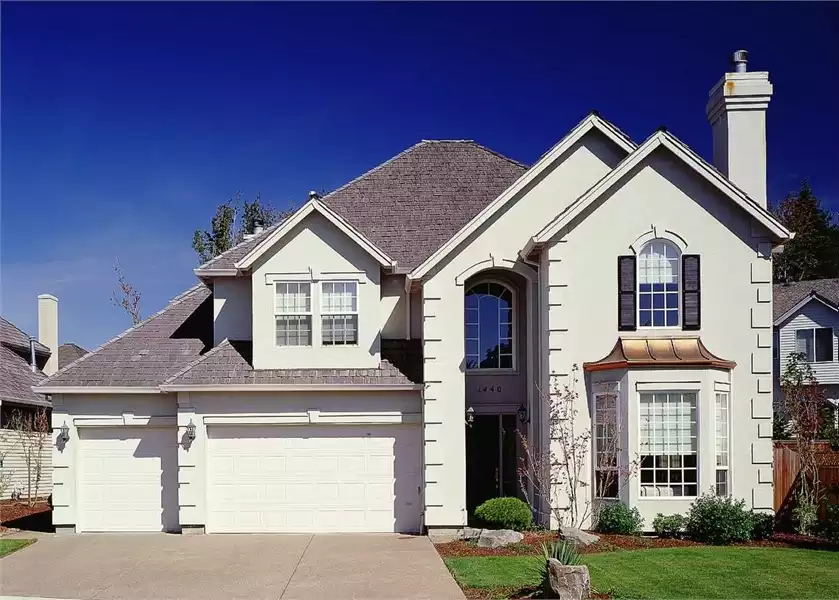 The home plan includes an attached garage, which can be built for two cars or three, allowing adaptability for different sized properties.
