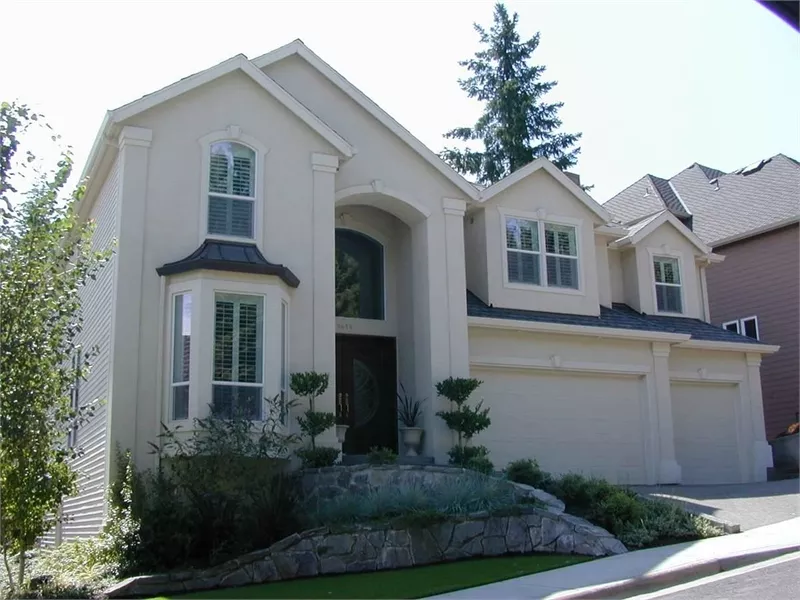 The family area revolves around the staircase. The huge kitchen features an island with a self-venting cooktop, a walk-in pantry, and a corner bake center. A sizable desk abuts the staircase. French doors in the bayed breakfast nook opens to a covered patio. A corner fireplace creates a focal point for the two-story family room.