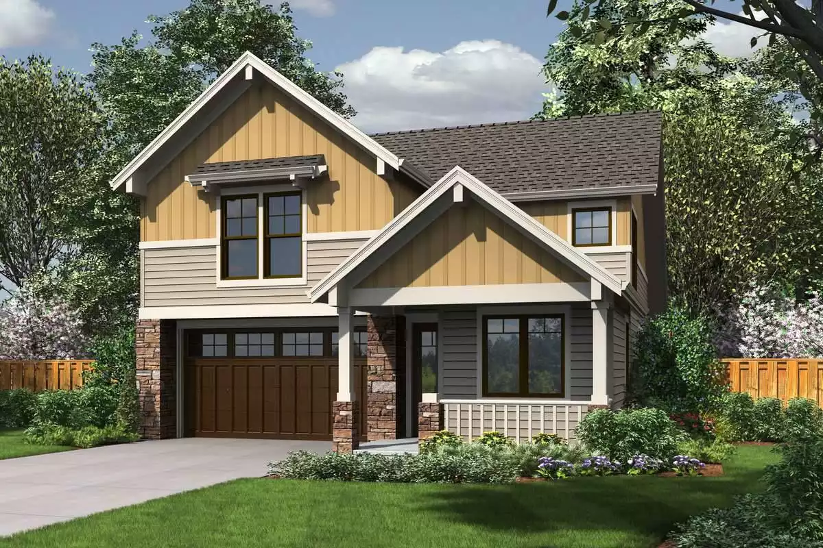 Simple charm and functional style give this Craftsman plan a wonderful personality, perfect for a new or growing family. Inside this lovely home, you will be pleased to find plenty of space, thanks to the 1,989 square feet that includes 2-floors with 4 bedrooms and 3 bathrooms, and even a large 2-car garage! Enjoy a beautiful summer’s day with this covered front porch before moving inside to cool off. Once indoors, you will immediately find a den to your right, which can double as a bedroom or office if necessary. Further inside, you will pass the staircase before entering in to the luxurious open concept main living space. Here you will love the vaulted great room and its cozy fireplace, as well as the nearby kitchen and its peninsula and attached dining room. A sliding glass door off of the dining room opens on to the covered back porch with a great patio space below. Up the staircase by the great room, you will find all of the bedrooms, including the master suite and its private bathroom and closet, as well as two secondary bedrooms and their shared bathroom.