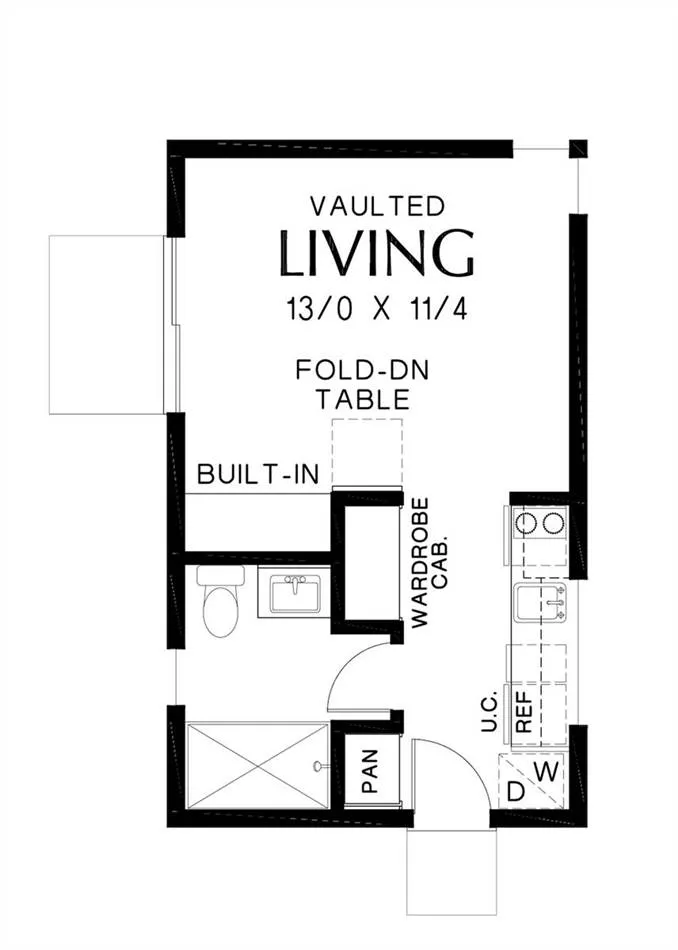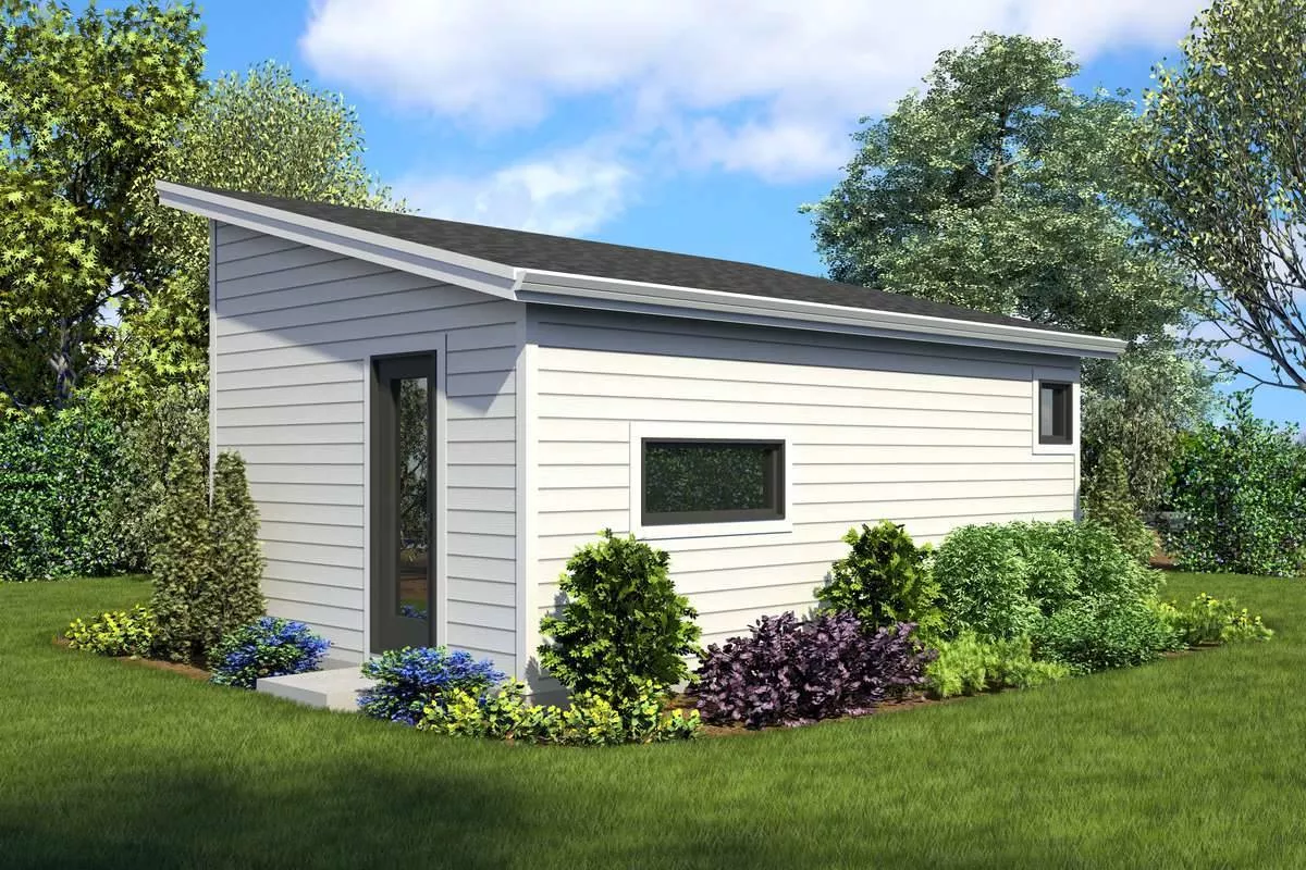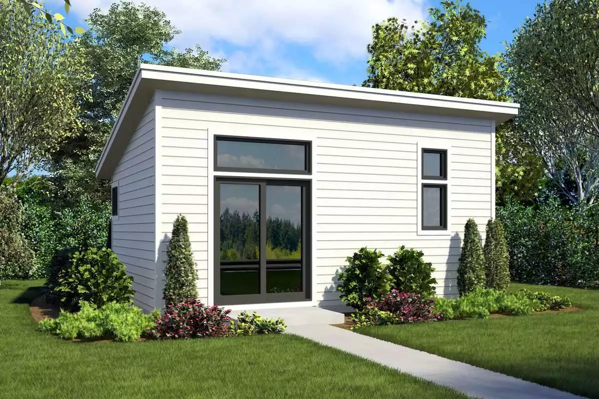 For an affordable and stylish plan, look no further than this farmhouse building. Useful as a full-time tiny home or a weekend getaway, versatile for any lot, this plan is 322 square feet of practical space. The front entry is joined by a sliding glass door on the opposite side of the home, creating two points of access indoors. Inside you’ll find a full bathroom and a multi-functional vaulted living room that can serve as a dining room, living room and bedroom, all in one! To top it all off, this plan offers the option for a kitchen if you decide that you really want to make this space feel like home and have maximum functionality.