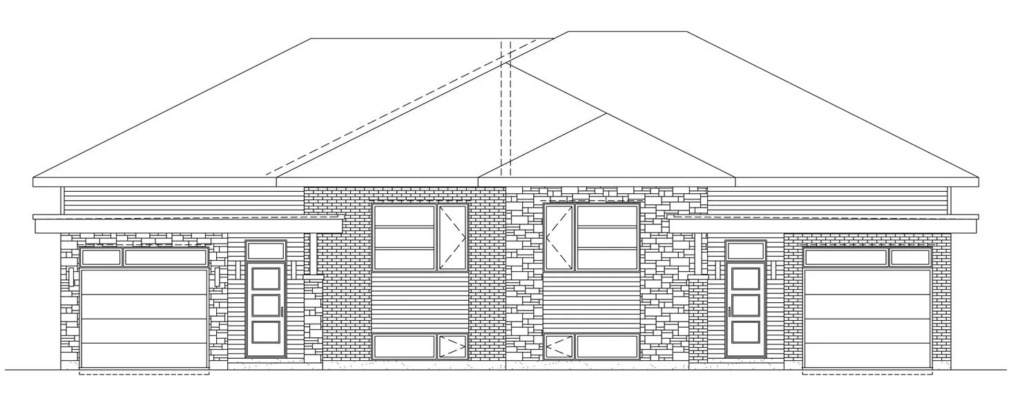 This affordable duplex plan which includes 1,039 square feet, 2 bedrooms, 1 bath, and a 1 car garage on each side. The exterior features stacked stone and siding. Large windows are located throughout all the main rooms allowing the sun to flood the home making it warm and bright. The kitchen with island and great room areas are combined so that family and friends can join together yet still have the separation that each room requires.  Two bedrooms with a shared hall bath are comfortable and allow desired privacy.  The primary bedroom has a large walk-in closet, and a hallway laundry room rounds out the amenities. Both sides of the duplex are identical making it easy and affordable to build.