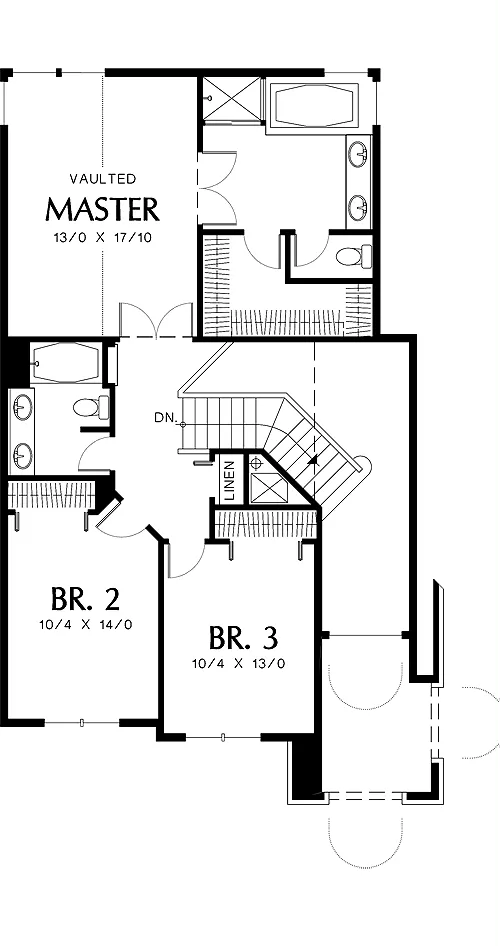 A master suite joins two family bedrooms on the upper level. It features a salon with vaulted ceiling and a bath with spa tub, walk-in closet and compartmented toilet. Note the art niche and linen closet in the upper-level hallway.
