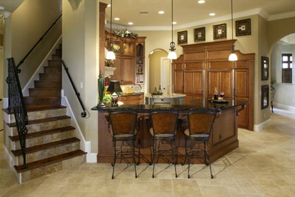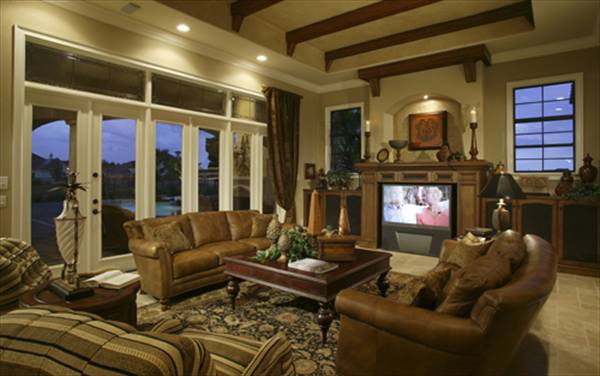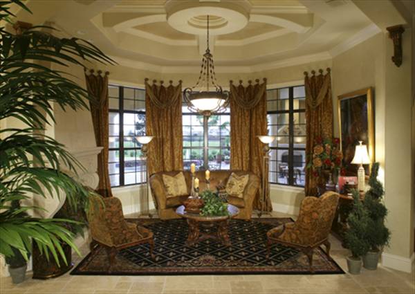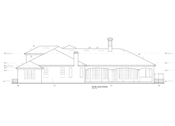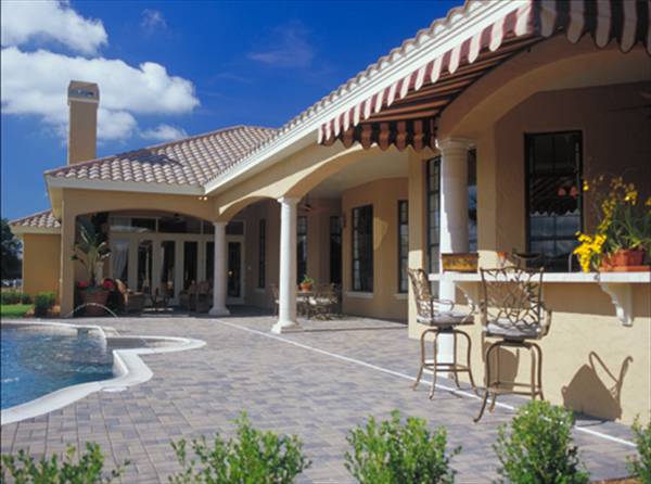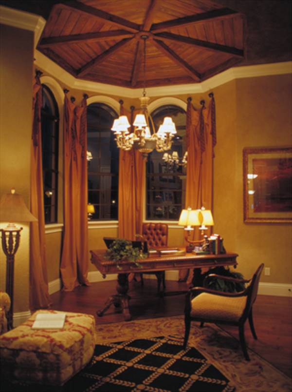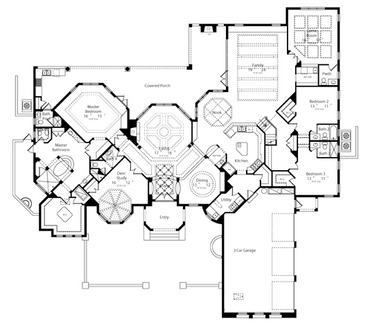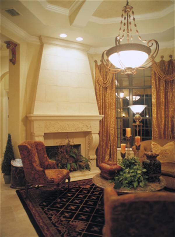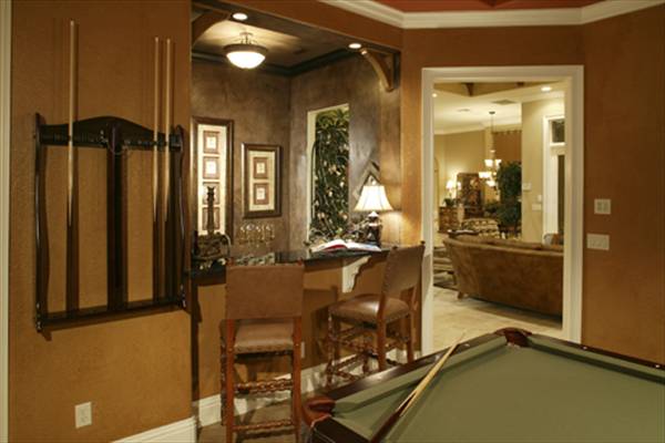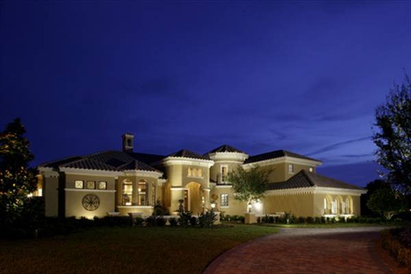 This sprawling home has the appearance of a Mediterranean villa. Interesting angles are found throughout the floor plan. The living room and family room can host any gatherings in comfort and style. A rear porch includes a summer kitchen for outdoor entertaining. Check out the opulent master bath! You wont find such posh features on most other home plans. The upper floor hosts a home theater and a meditation room. The home measures 5,553 square feet.