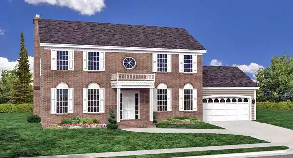 This economically designed two-story offers a traditional exterior with updated interior features. The oversized central foyer separates the two formal living spaces at the front of the home. The foyer's vaulted ceiling is accented with a lovely oval window, while the living room and dining room are dressed up with arched windows.