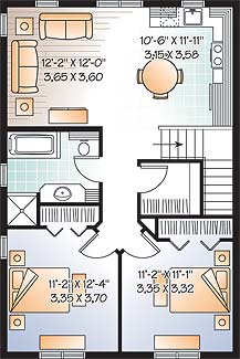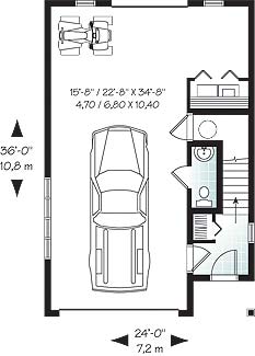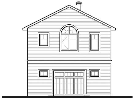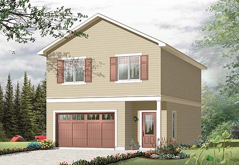 Popular as a cottage with room for toys, as an interim dwelling while the main house is being built, or as a guest suite or mortgage helper, this little dwelling unit packs a lot of features into a small footprint. The ground floor features a one-car garage with workshop, laundry and interior or exterior access to the staircase. At the top lies an open-concept living area with an eat-in kitchen and living room. Two bedrooms share a bathroom with bathtub and separate shower. In high-density areas, this is an excellent design, including all expected amenities and an attached garage.