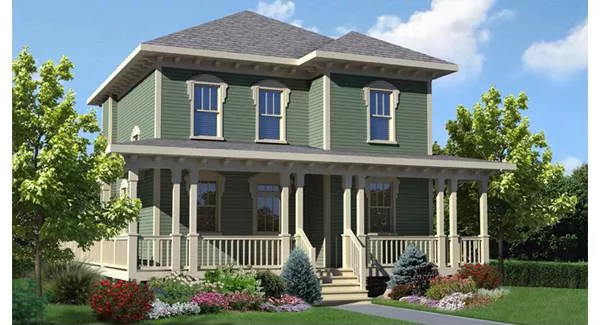 A wonderful cottage with touches of Ranch flair, this 2-story plan draws you in from first glance. Ornate windows join with spectacular finishing details to create a custom look to this home, while an amazing wraparound porch spans almost the entire home. Step foot on to the covered porch and enter on to the grand foyer. To your left, a discreet and convenient powder room is great for guests, while to the right, a formal dining room with kitchen access is perfect for large dinners or entertaining. Directly ahead of you lies the spacious living room which is open to the breakfast nook and peninsula kitchen. Also off of the living room is access to the rear porch which connects all the way around with the front porch, a truly amazing space! The second floor is home to two secondary bedrooms which share a full bath and are great for growing kids, as well as the master suite, a wonderful bedroom with a walk-in closet.