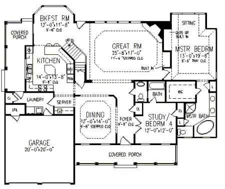 A slightly smaller version of plan no: 2799 with a front entry garage. A large spacious kitchen with a center island workspace opens over the snack bar into the bay window breakfast room. The Great Room has a large corner fireplace and high ceilings, and leads directly into a grand master bedroom suite. The open dining room looks into the Great Room or across the foyer into an optional fourth bedroom or study.