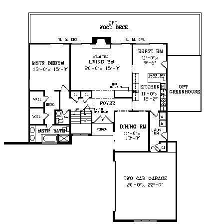 Although I created this design to specifically fit narrower lots, it is not short on living features. All major living areas face the rear deck, including the dramatic great room, which includes a vaulted ceiling and fireplace. The master suite includes a luxurious private bath, two walk-in closets, and doors to the rear deck. Although it is shown closed, the breakfast room could be built wide open to the great room. The optional greenhouse alongside the kitchen widens the home by 9 feet.