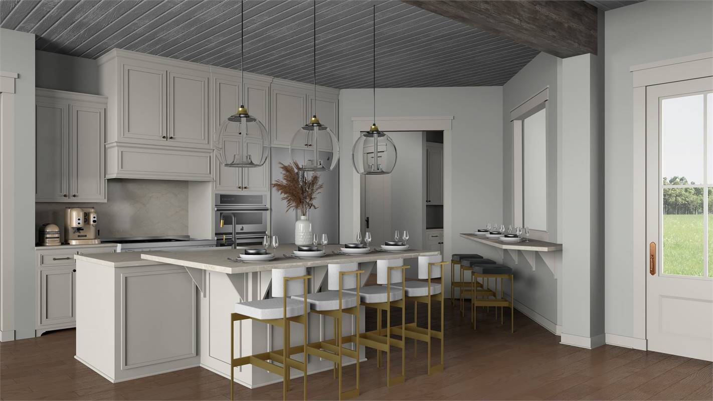 Gables and columns contribute to a tasteful façade for this farmhouse-style house plan, with three bedrooms, 2.5 baths and 2,287 square feet of living area. You'll enjoy relaxing with friends in the great room of this home plan, with its high ceiling and stately fireplace. Expand any gathering to the rear porch, where a starry sky will be a welcome sight. Note the abundant snack seating in the open kitchen. Natural light is a feature in the dining room and the breakfast nook, which host meals in style. The vaulted master bedroom is a serene retreat. Note the garden tub in the private bath, along with a separate shower and a double vanity. A walk-in closet keeps your clothes organized. Two secondary bedrooms with walk-in closets share a split bath. Our customers love the resource nook in this home design, for computer work and menu planning. Are you considering taking art lessons? Use the bonus room above the garage as a private studio.