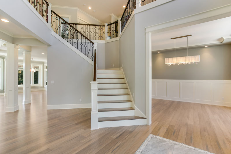 On the main level, an angled staircase leaves the foyer wide-open to views of the dining room and great room. In the center of the home, a feature-packed kitchen seamlessly joins the breakfast nook and great room, making it the ideal entertainment hub. A walk-in pantry, a planning desk, a butlers pantry and space for professional-style appliances ensure delight for the cooking enthusiast. Tucked away are hardworking spaces, such as a study with built-ins and a large multipurpose space off the garage. The multipurpose space provides laundry facilities, a bench and closet for dropping off coats and shoes, and an expanse of cabinet and counter space to use as hobby work space.