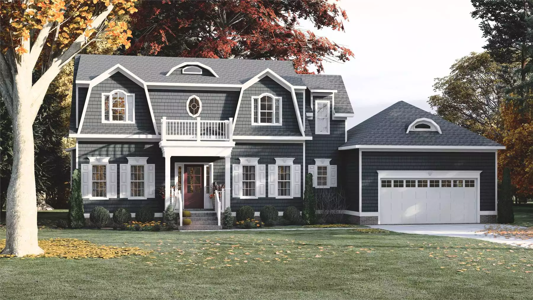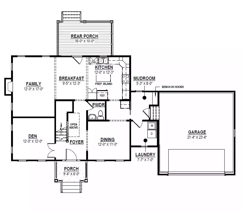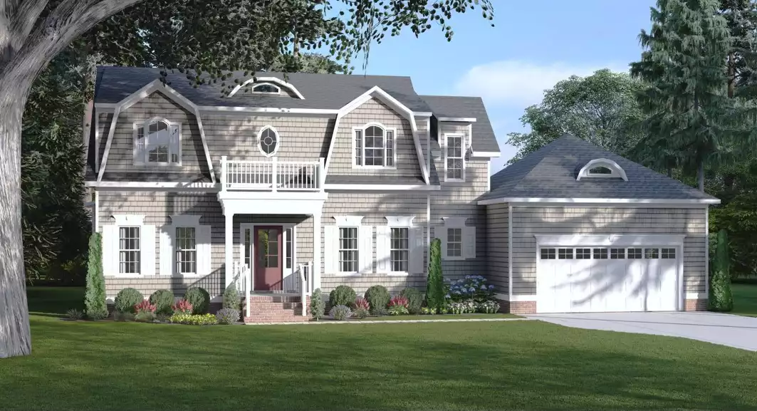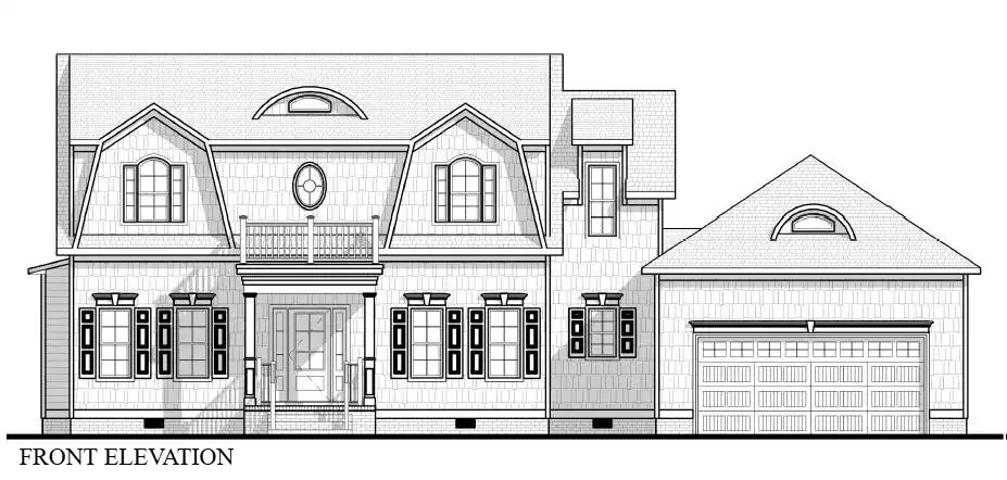 The Royal Road is a charming two-story Cape Cod-inspired home offering 2,291 sq. ft. of living space. The main floor features a welcoming foyer with open stair, a formal dining room, den, family room, and a spacious kitchen with prep island and breakfast nook. Everyday function is supported by a mudroom, laundry room, and powder bath, while outdoor living is extended with a rear porch. Upstairs, the primary suite includes a walk-in closet and a private bath, accompanied by three additional bedrooms and two more full baths. A loft/study space offers flexible use for homework or a home office. With its gabled dormers, balanced façade, and traditional shingle details, the Royal Road blends classic curb appeal with a comfortable, family-oriented layout.