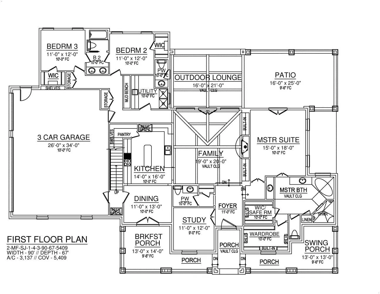 3,411 square feet. 4 bedrooms. 3 full baths. 2 half baths. 3 car garage. Shall we go on? We shall...because this home plan has so much to offer and we've just gotten started! Would you like your morning coffee indoors or out? You have your choice! Thanks to the open layout and easy access to the front porch or outdoor lounge and patio out the back - you can enjoy your coffee where ever you'd like! Entering the home through the main entrance, you'll find yourself in the foyer. You'll walk past the study and one of two powder rooms before entering the family room. The vaulted ceiling in the family room also extends out to the outdoor lounge. The state-of-the-art kitchen includes a walk-in pantry, as well as a kitchen island. Two bedrooms extend past the kitchen, as well as the combined utility/mudroom. On the right-hand side of the home, you'll find the master suite. Complete with an outdoor access to the rear patio, as well as access to the front porch swing, you have easy access to outdoor living via private entrances. The master bath includes a separate shower/tub, dual vanity sinks and a sizable wardrobe.  Upstairs, you'll find bedroom number 4, a bath, game room and mechanical area for the home.