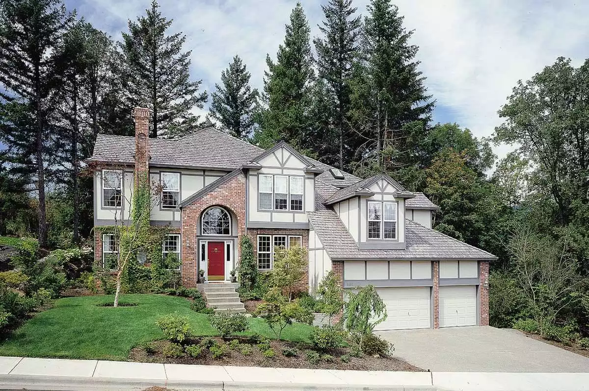 A bonus room with a vaulted ceiling and two dormer windows extends across the three-car garage. Two sets of stairs lead to the upper floor and to the family room.