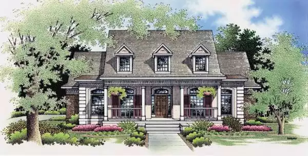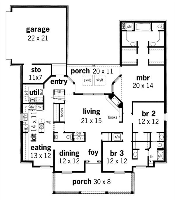 This attractive home is designed with expandable space enabling first time homebuyers to move up in size, as needed without the need to relocate. The rear entry provides access to the kitchen, utility, garage, sun porch and stairwell. The stairwell is open to the living room and ascends to the pre-planned but unfinished upper level. The ceiling of the living room is sloped to the upper level and includes a corner built-in fireplace with bookshelves at each end of the room. There is also a small wet bar tucked behind bi-folding doors. There is a large built-in serving hutch and china in the eating area and an island in the adjacent kitchen. The two secondary bedrooms have private dressing rooms and walk-in closets. The master suite has a bay area sitting space and access to the rear covered sun porch. The master bath has twin walk in closets and dressing rooms with separate shower and toilet compartments.