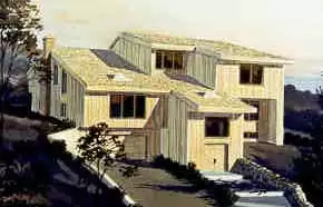 This dramatic contemporary two story home was designed to satisfy a steep site that slopes up from the road. From curb to rear of the home the design could accomodate a 16 foot change of grade, depending on the setback from the road. It features large living areas both formal and informal as well as 4 bedrooms.