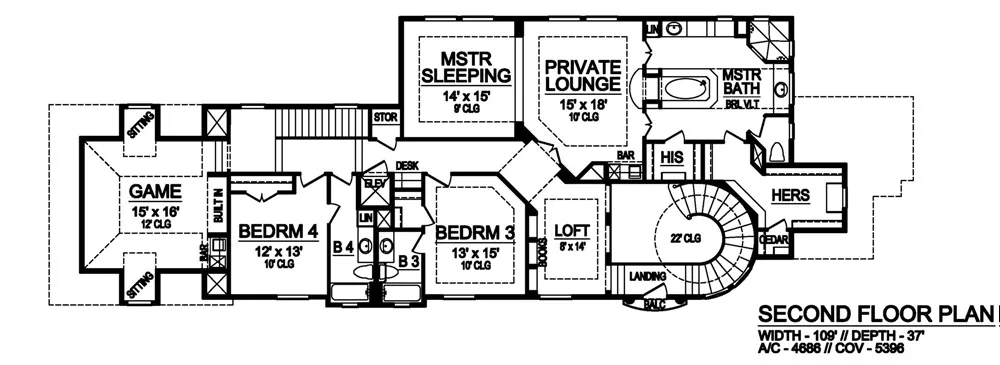 You'll experience the openness of this home as you walk into the 22' high Foyer with line of sights into the Family, Dining, and Breakfast Nook, as well as the backyard through large windows. To break up the Foyer, Family, and Dining rooms is a large decorative pillar, adjacent to the spiral staircase. The Family room is accompanied by built-in shelves, a bar, and a corner fireplace. Just behind the staircase and family room is a quiet Study, perfect for working from home or reading a book and relaxing. To the right of the Dining room is the Kitchen and Breakfast Nook, with added counter space with the large central island. A family bedroom with a walk-in closet and a full bathroom is tucked away behind the kitchen and is next to the utility room and the two-car garage. This private entrance near this family bedroom would be perfect for guests, a teen or in-laws. An elevator is located at the corner of the breakfast nook and the kitchen, as well as a secondary staircase; both lead you up to the second floor just outside two family bedrooms, both featuring a full bathroom and walk-in closets. The Master bedroom has a private lounge with a bar and a luxurious master bathroom. The master bath is complete with a barrel vaulted ceiling, a separate shower, a center tub, his and hers vanities, as well as his and hers walk-in closets with a built-in cedar closet. To complete the second floor is a built-in desk, a balcony, a game room, and a loft. Both the game room and the loft have added storage with built-in shelves, completing this luxury house plan.
