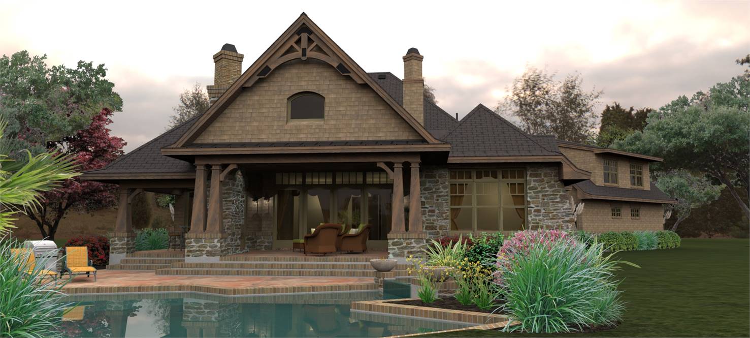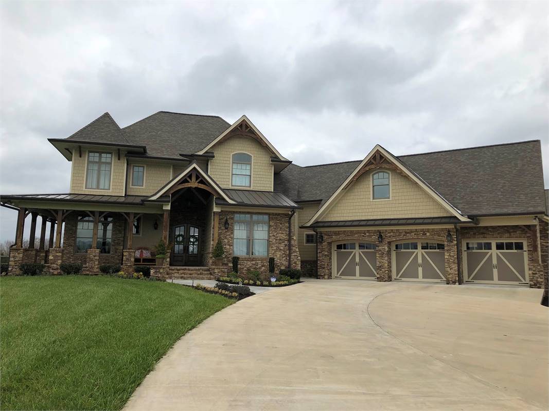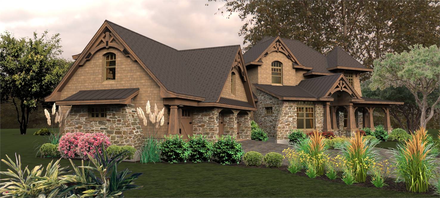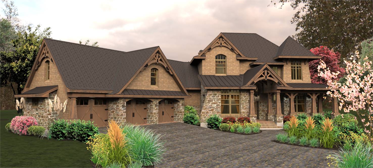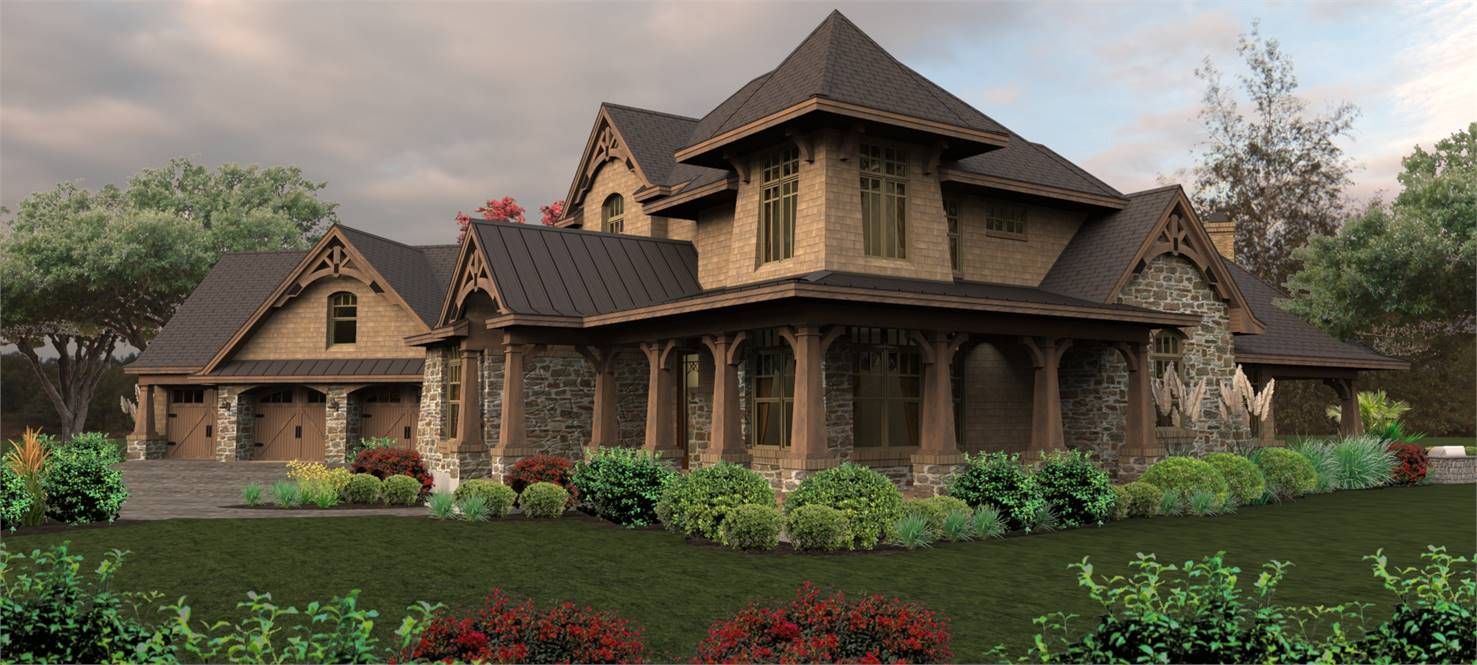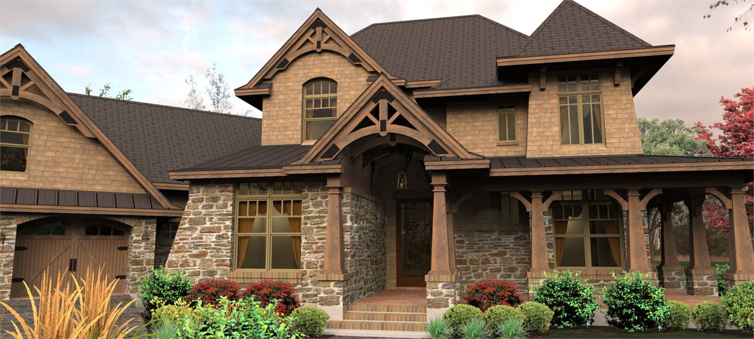 A charming tower graces a wrap around porch with rustic detail. Entrance reveals a Dining Room served by a butler's pantry, which leads to an Island Kitchen. A wide arch provides view into the vaulted Family Room.