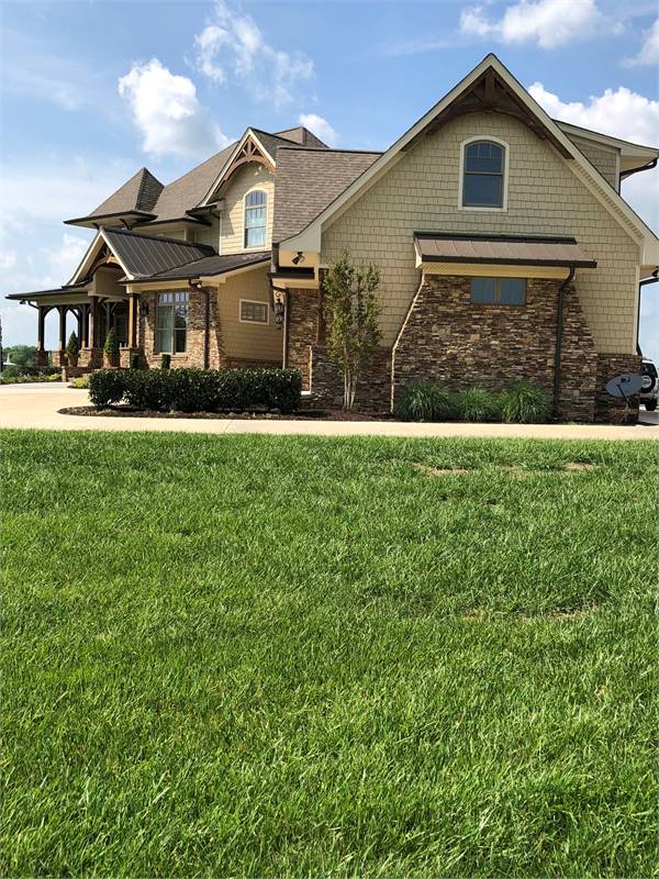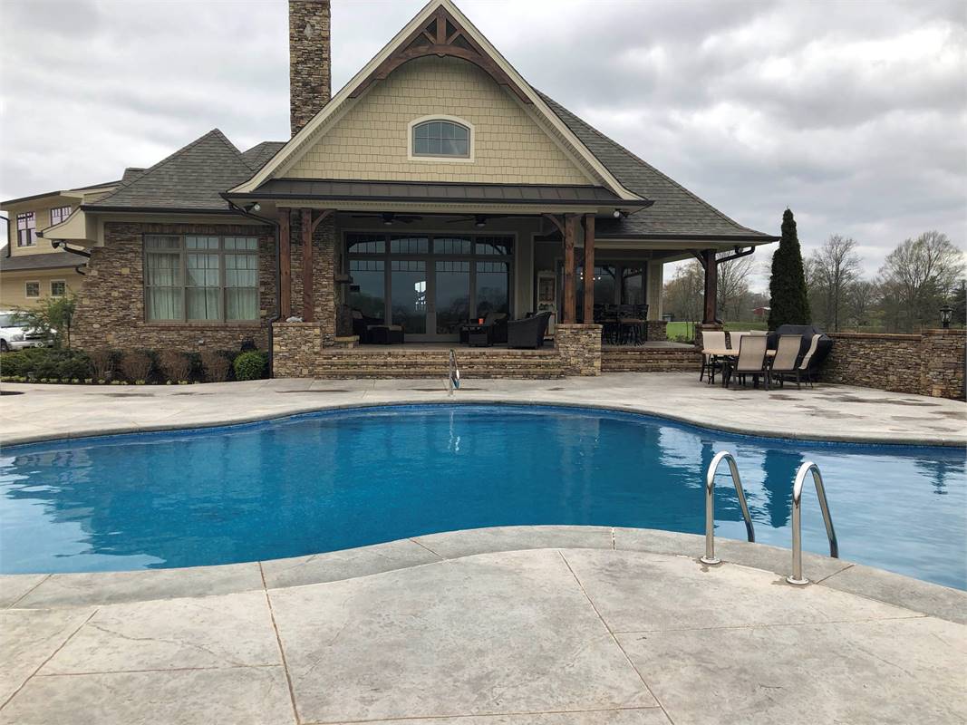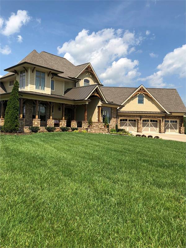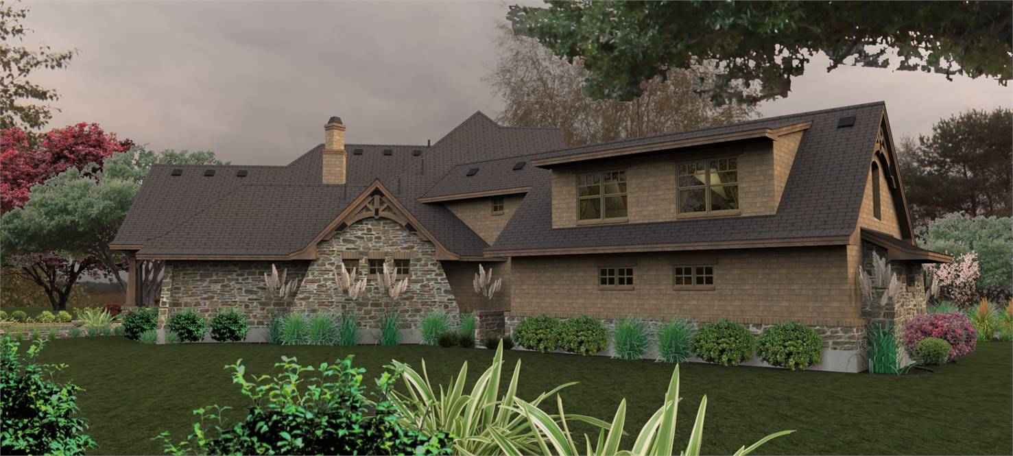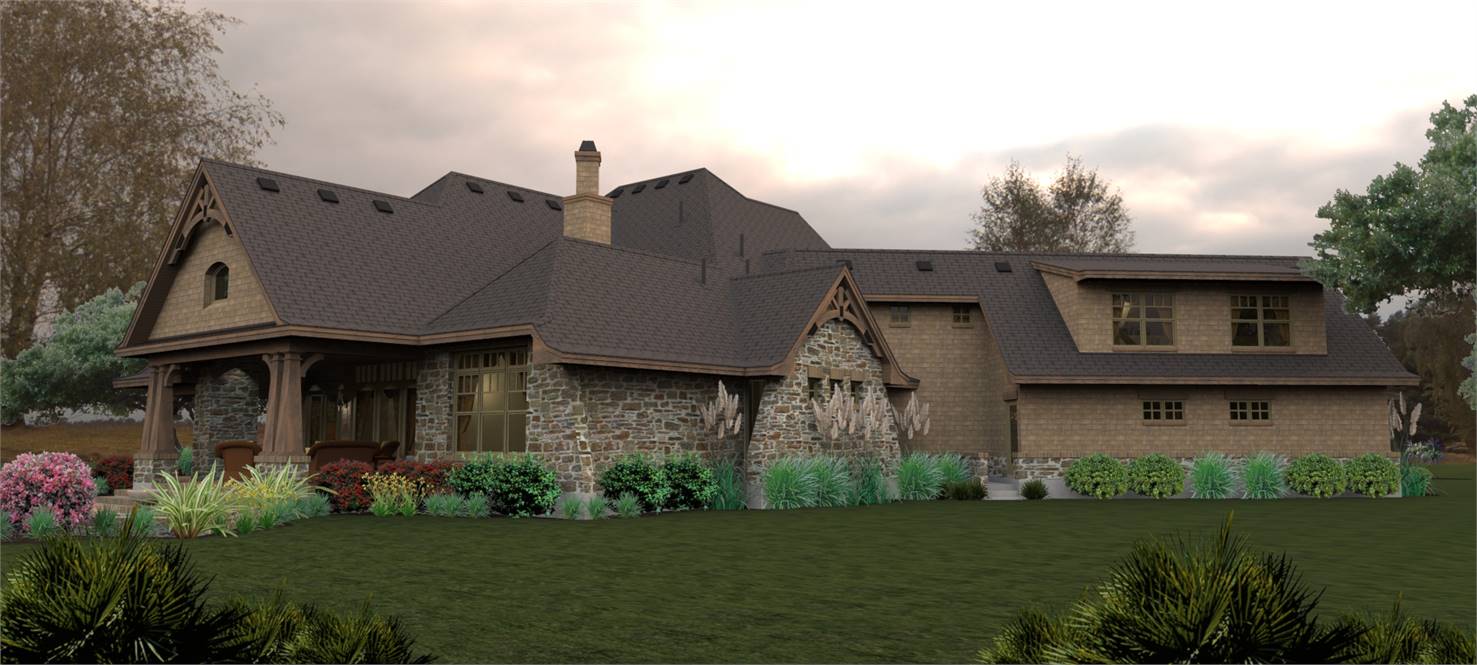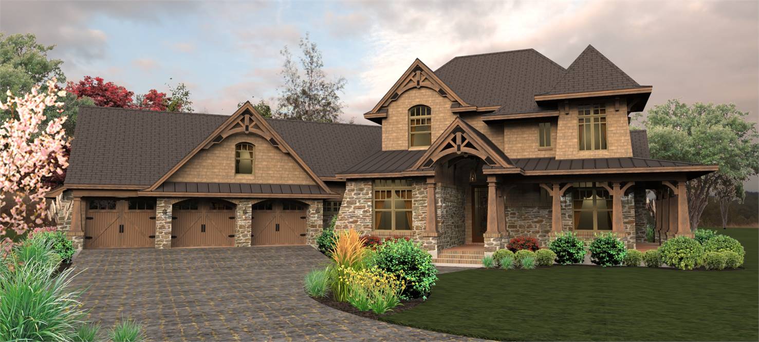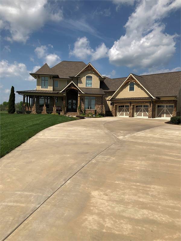 A charming tower graces a wrap around porch with rustic detail. Entrance reveals a Dining Room served by a butler's pantry, which leads to an Island Kitchen. A wide arch provides view into the vaulted Family Room.