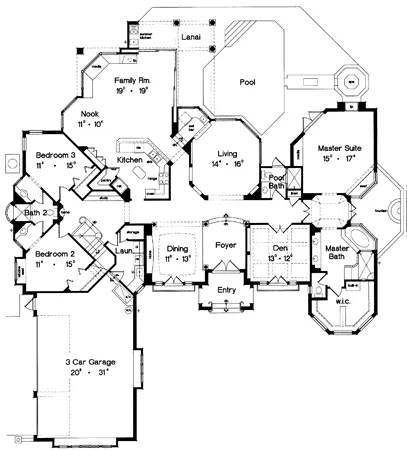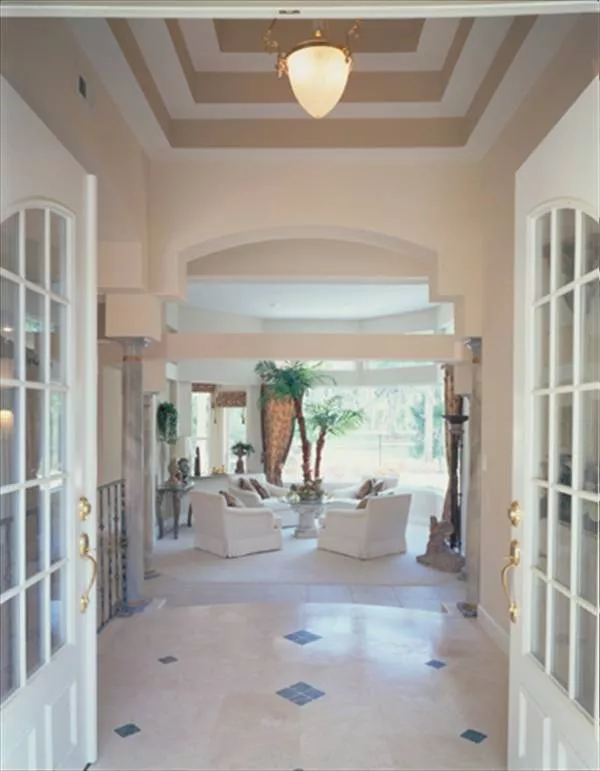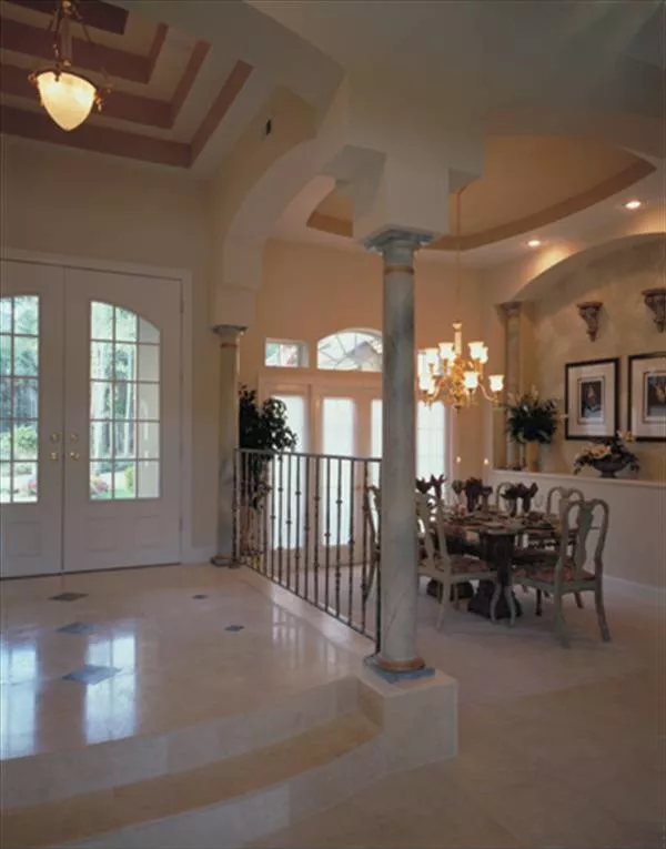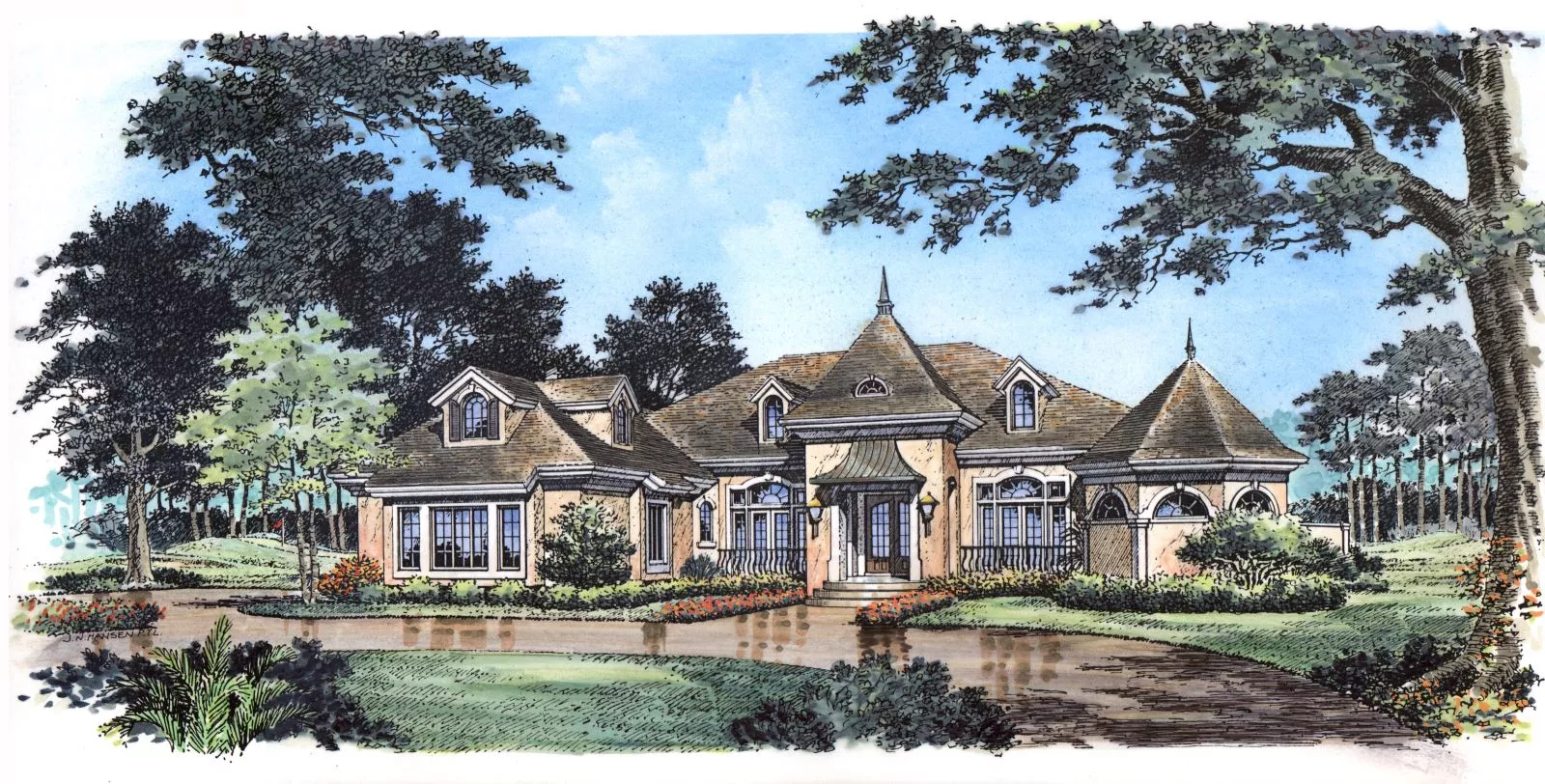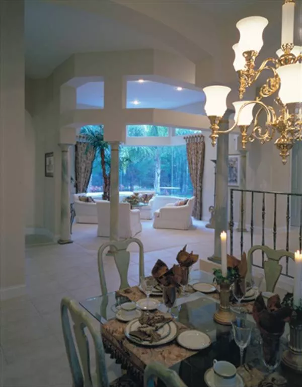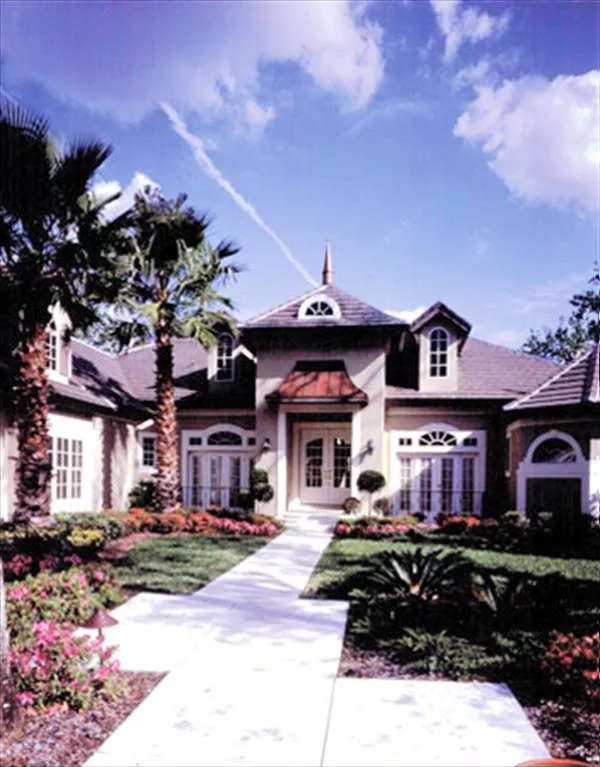 Peaked roofs and charming dormers make this house truly delightful. As you pass under the copper roof of the entry onto the raised foyer, the views of this home reach out in all directions. The Living room seems to float upon the water of the pool, which laps up against the walls of the house. Interesting niches and drywall detailing abound throughout the home. The Den, complete with balcony has a coffered ceiling and is located just opposite the convenient pool bath.