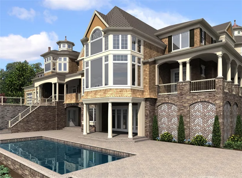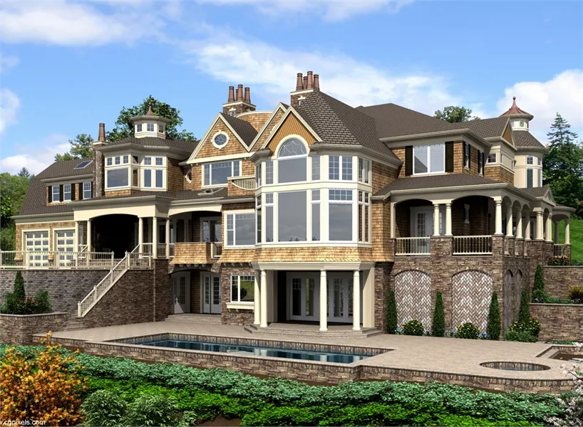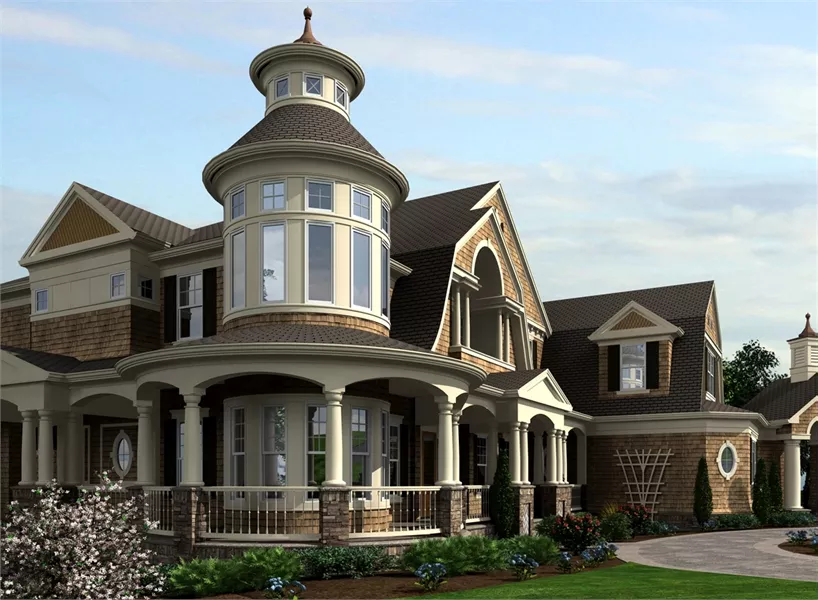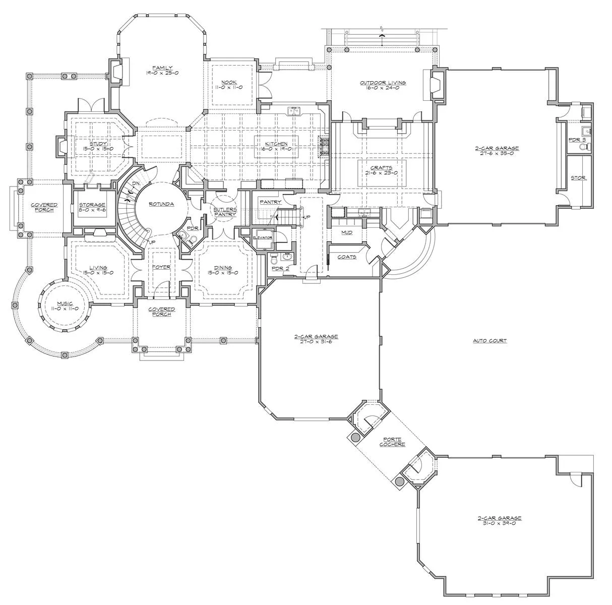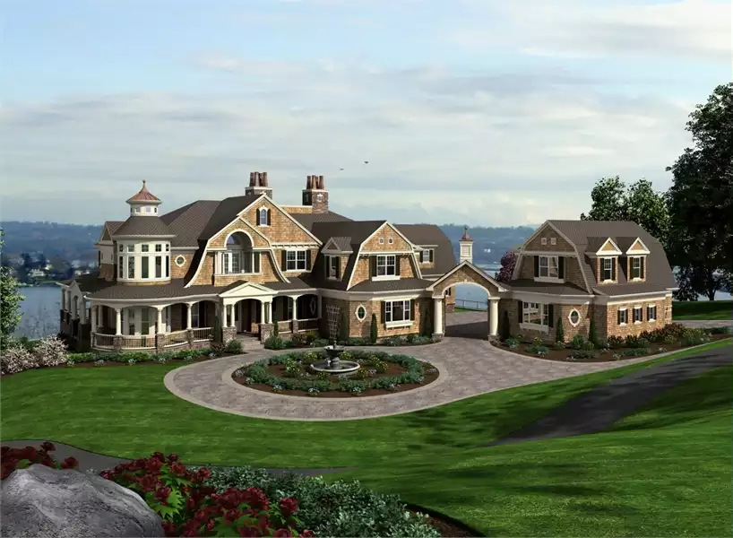Quaint rooflines and shuttered windows adorn this luxury cottage-style house plan, with six bedrooms, five full baths, three half-baths and 11,000 square feet. Warmed by a fireplace, the living room in this home plan flows into a circular music room. Relax with friends in the sizable family room, brightened by windows and enhanced by a fireplace. The vast island kitchen flaunts a nearby pantry. Stage formal meals in the butler's pantry, before serving them in the dining room. Eat casual meals in the bright nook, or step outside to feel cool breezes. One floor up, you'll love the peaceful master bedroom, along with its sitting room and two-sided fireplace. In the opulent bath, you'll find a garden tub, a separate shower and two vanities. Additional large bedrooms and private baths are nearby. The oversized bonus room in this home design would be great for hobbies. Our customers love the main-floor areas for studying and crafts.