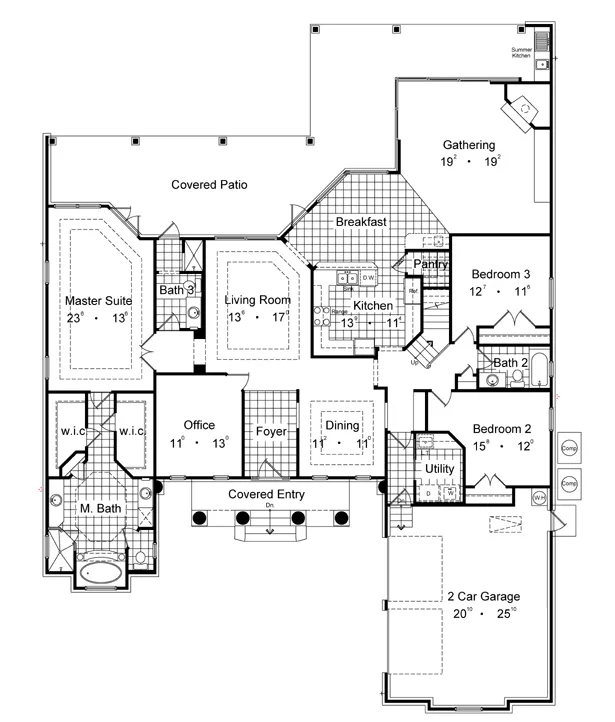 Very stately curb appeal, this plan was born from Home Design Services best all time seller. Tried and proven floor plan design with a new Georgian look. The doric columned entry brings you into this magnificent home. The formal living room straight ahead and the dining room to the right both have coffered ceilings. There is an office next to the foyer as we move toward the master suite and its large coffered ceiling bedroom area with sitting zone and access to the covered patio. The stepped ceiling master bath is complete with his and her walk-in closets, his and her vanities hers with a make-up area, walk-in shower, private toilet chamber and a tub area flanked by columns. Between the master bedroom and the living room is a powder room for guests that also doubles as a pool bath off the covered patio. The family wing of this home is designed for large gatherings with its large kitchen with walk-in pantry, a large nook with access to the living room as well as the covered patio and gathering room. The gathering room has pocket sliders that come together at a columnless corner. When open it gives the feel of the whole covered patio as part of the gathering room. The secondary bedrooms share a bath and access to the upstairs bonus area.
