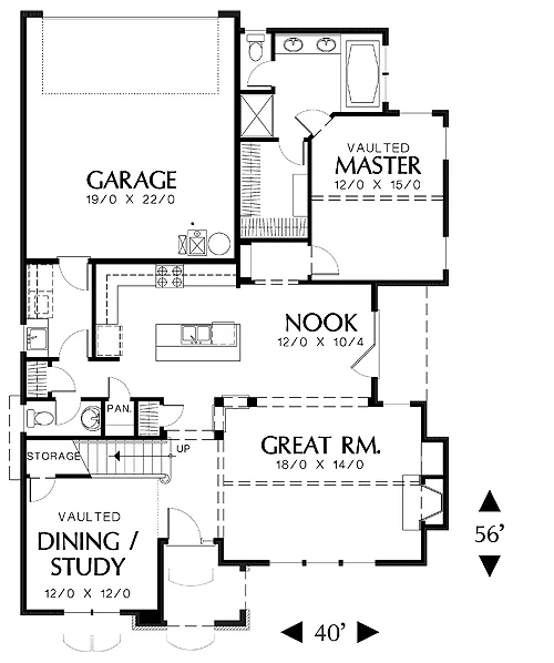 Stone detailing on the facade of this home leaves a lasting impression and complements multi-pane windows to either side. The recessed entry opens to a vaulted dining room (or make it a study) on the left and an open great room on the right. The great room has a fireplace and sports decorative column detailing that separates it from the hallway, and kitchen/nook area. An island in the kitchen contains a double sink and is just across from a walk-in pantry. The split bedroom plan puts the vaulted master suite on the first floor. It has a walk-in closet and bath with separate tub and shower and dual sinks. Family bedrooms are on the upper level and share a full bath. The service entry to the garage contains space for a washer and dryer and a laundry tub. A half-bath and broom closet are nearby.