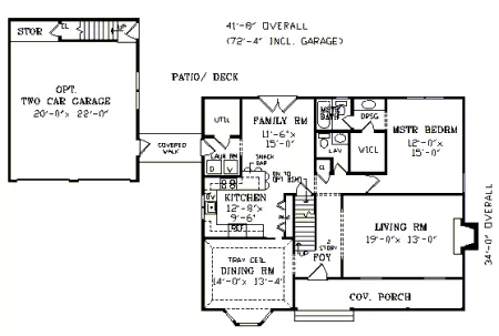 A covered front porch with Victorian trim, triple dormers, and a bay window combine for a pleasing, charming exterior look. The front half of the plan incorporates the formal living and dining rooms for entertaining guests. I designed the dining room with a high tray ceiling. The informal family living area faces the rear patio and includes a spacious kitchen with pantry, a built-in snack bar and a large family room. The main-floor master suite includes a dressing area next to the walk-in closet and a compartmented bath and toilet. There are two additional bedrooms with a full bath upstairs.