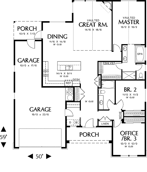 The master suite lies to the rear of the plan and features a vaulted ceiling and bath with spa tub, separate shower and walk-in closet. The great room is also vaulted and has a corner fireplace. It is open to the dining area and kitchen (note the built-in desk in the kitchen).