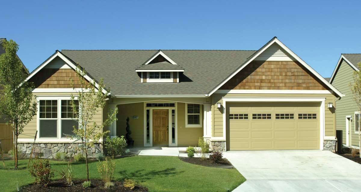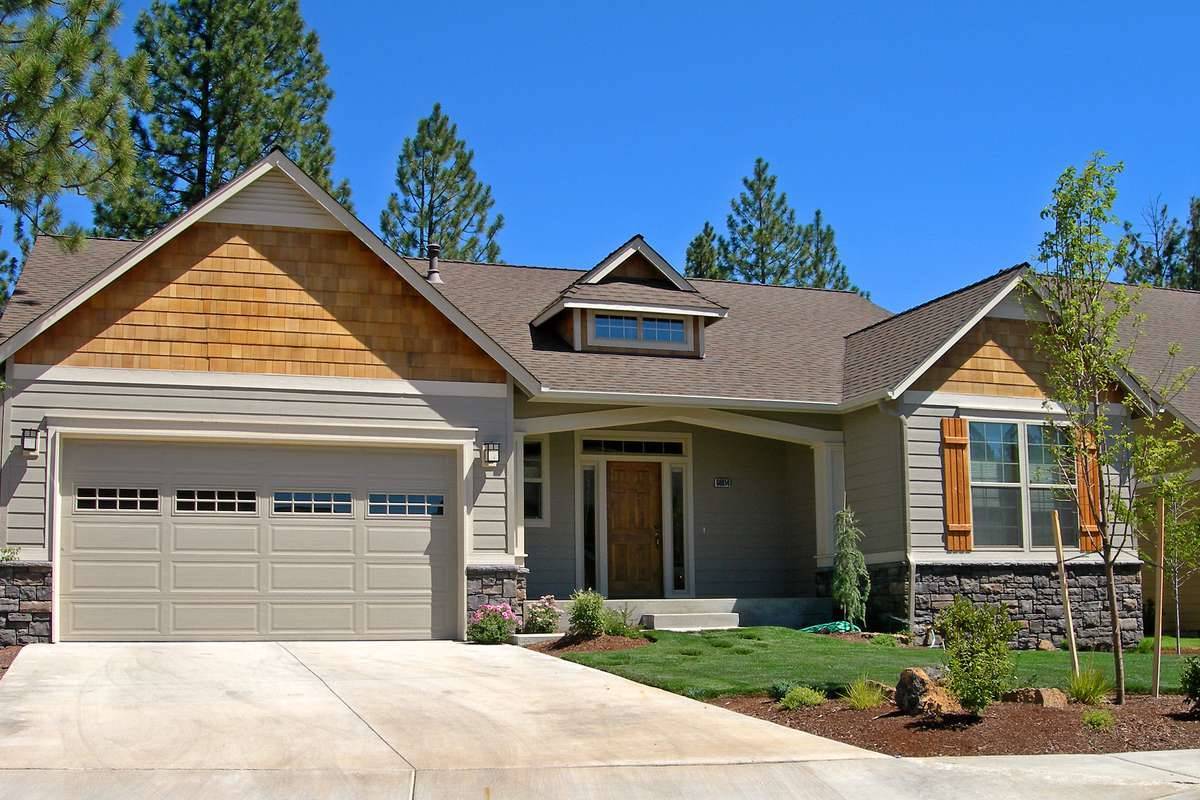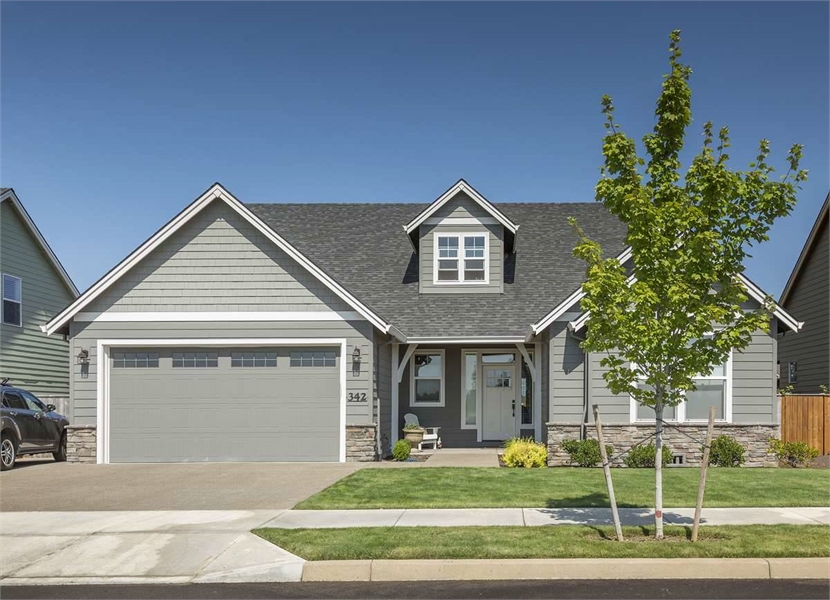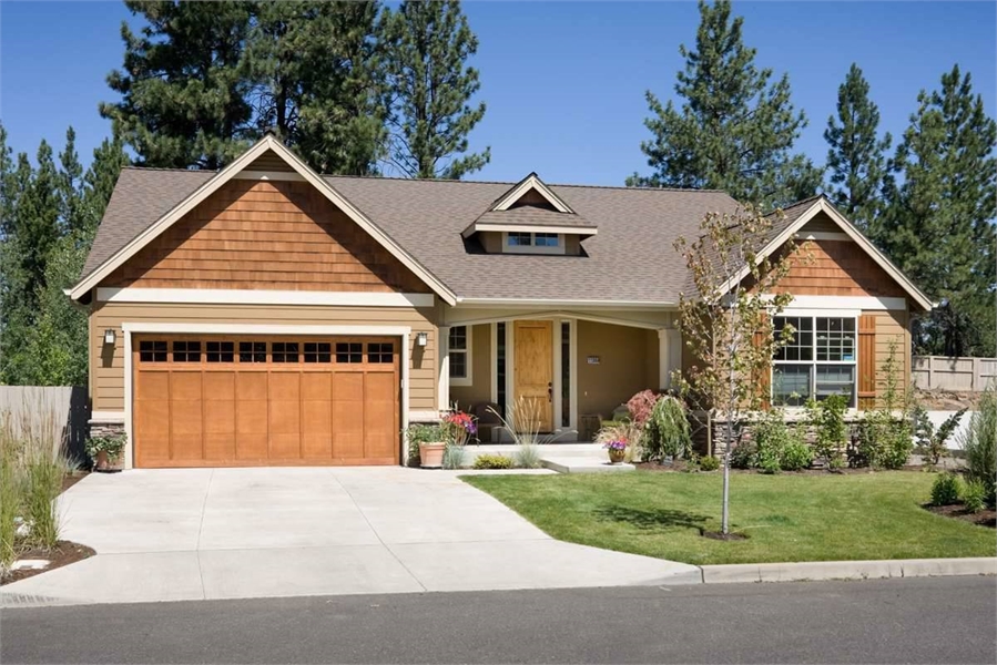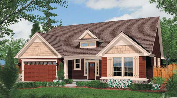 Neat and petite, this smaller one-story home is a picture of Craftsman delights. Notice the suggestion of pillars at the front entry, the transom window over the entry and the touches of cedar shingles and stone as accent. The floor plan lives large, with an extended two-vehicle garage on one side, a porch and patio to the rear and the option of two or three bedrooms. A central hallway connects interior spaces and leads through a laundry area to the garage. Use Bedroom 3 as an office if you chooseits perfectly situated to receive clients who arrive at the front door. A full bath serves both Bedroom 2 and Bedroom 3.