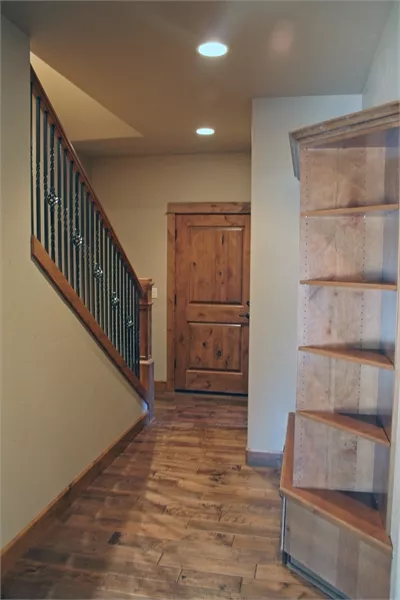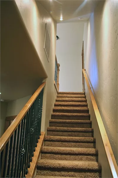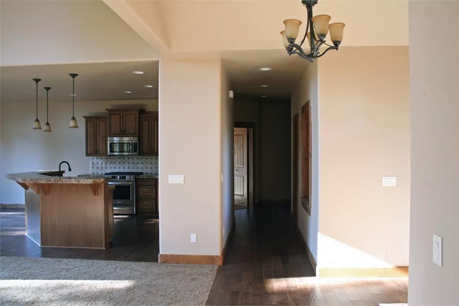 A short hallway provides access to a powder room and laundry room as well as the master suite, and a stairway to the guest suite upstairs.