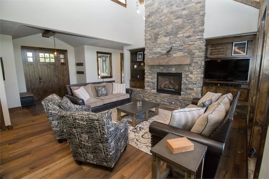 You will immediately feel welcome when you approach this Craftsman bungalow. Step inside and you will see a large living space that features a fireplace on the left. The open concept layout allows anyone in the dining room or living room to enjoy a view of the fireplace. The far wall features large floor to ceiling windows that flood the great room with natural light.