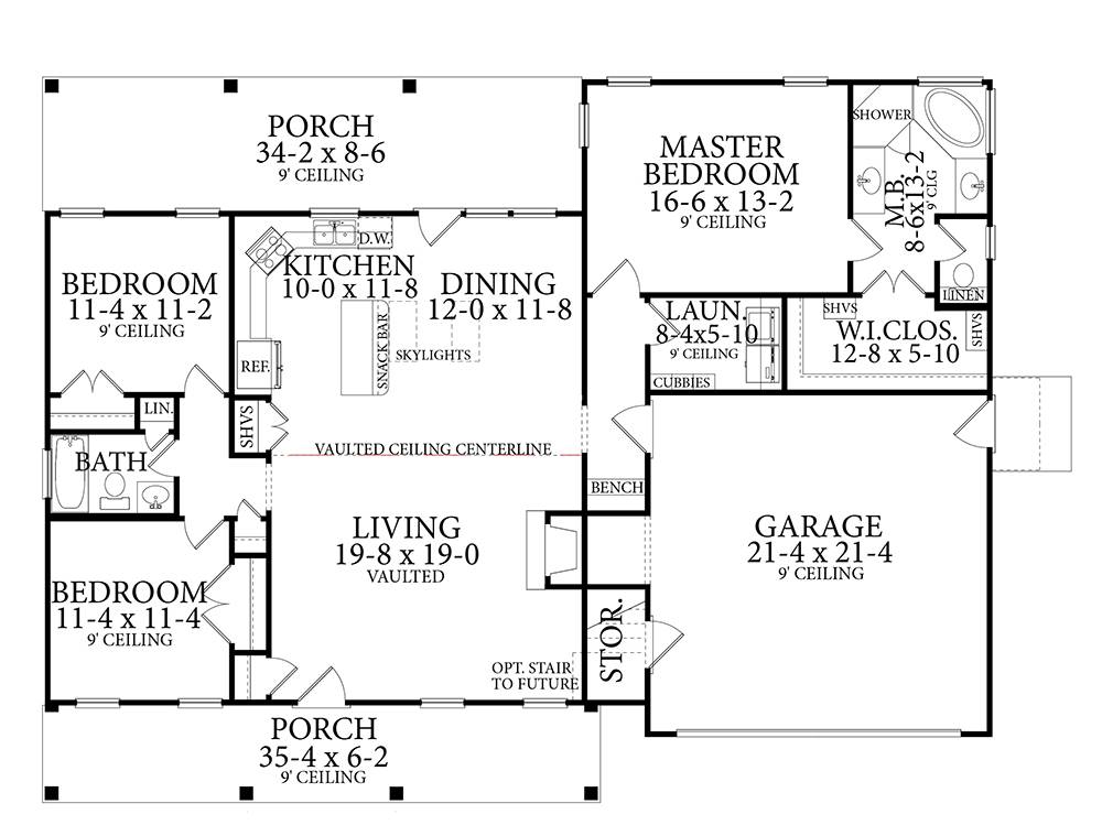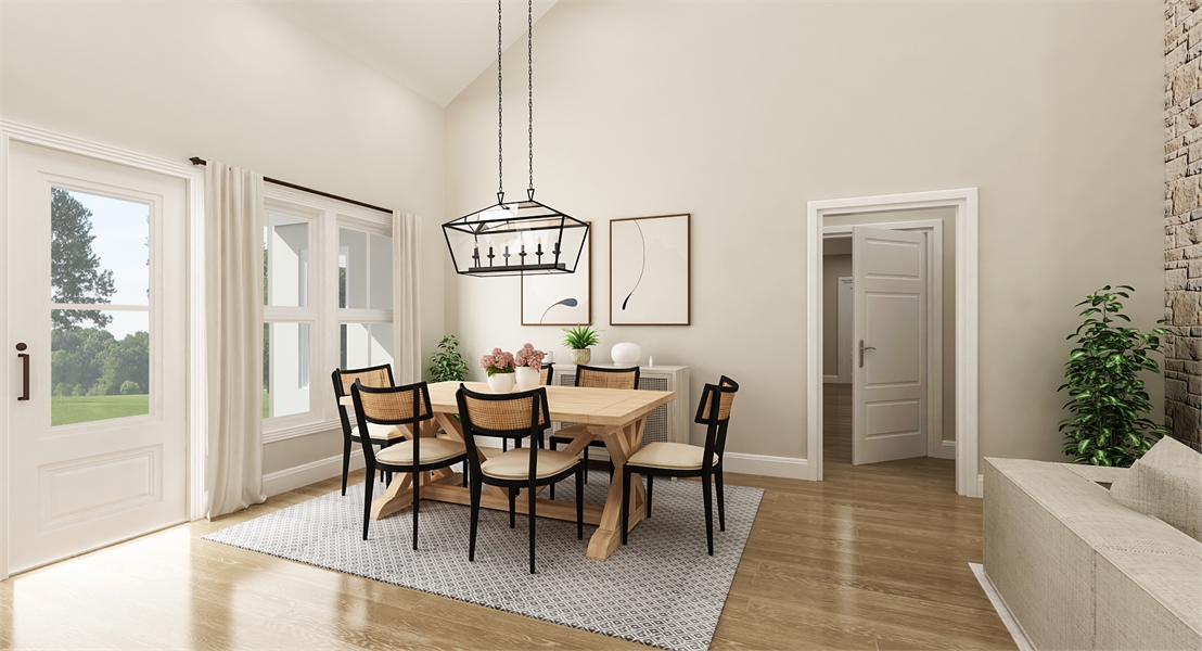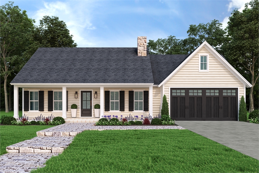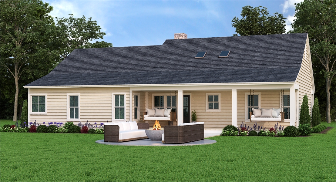 Introducing The Cloverwood, our newest America’s Choice House Plan. This exclusive plan is an updated version of THD-7487 where you can see a full 3D video tour, with all of the same great features, but with gorgeous vaulted ceilings in the open-concept living room, dining area, and kitchen. This one story, 1,616, s.f. affordable home showcases a front entry, two-car garage and a charming, covered front entry porch. Shining lots of natural light into the kitchen and dining, you'll find optional VELUX skylights that can be customized with your builder if you choose to remove. A kitchen island and raised snack bar offers lots of serving and entertaining options. On the left side of the house, two bedrooms and a full bath with linen closet offers plenty of space for kids and guests. The master suite is privately located on the opposite side of the home with a spacious ensuite bath with dual vanities, a wonderful garden soaking tub, separate shower and extra large closet. Accessible from the dining area is another rear covered porch perfect for outdoor entertaining. This home is perfect for first time homeowners, empty nesters or those wanting to embrace affordability and comfort!