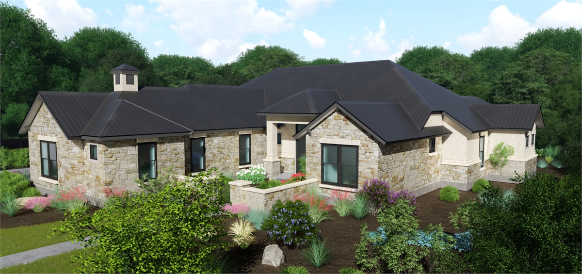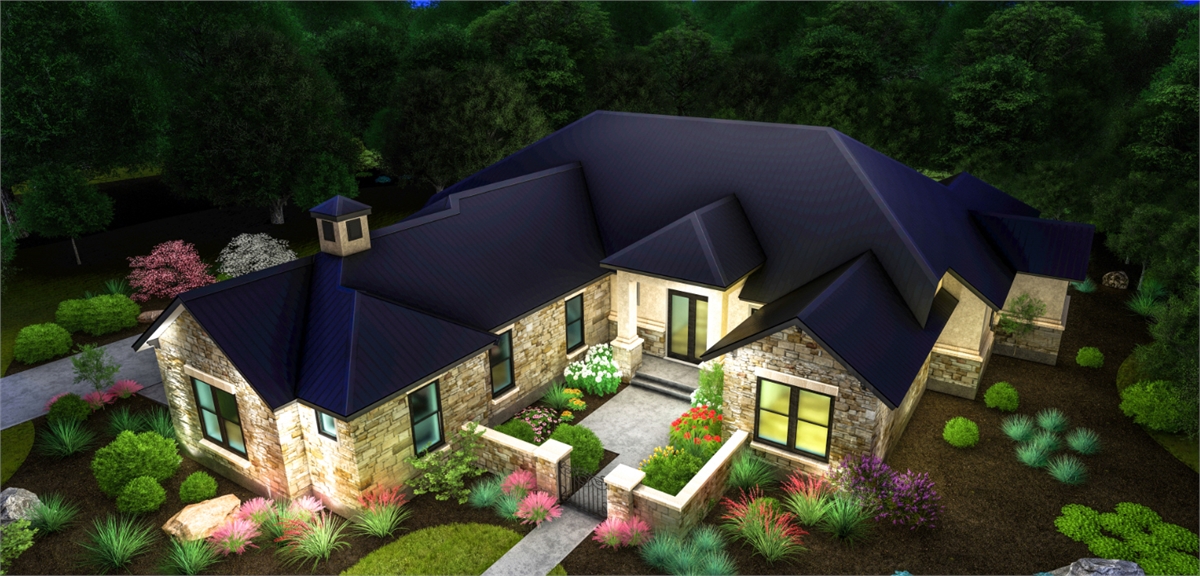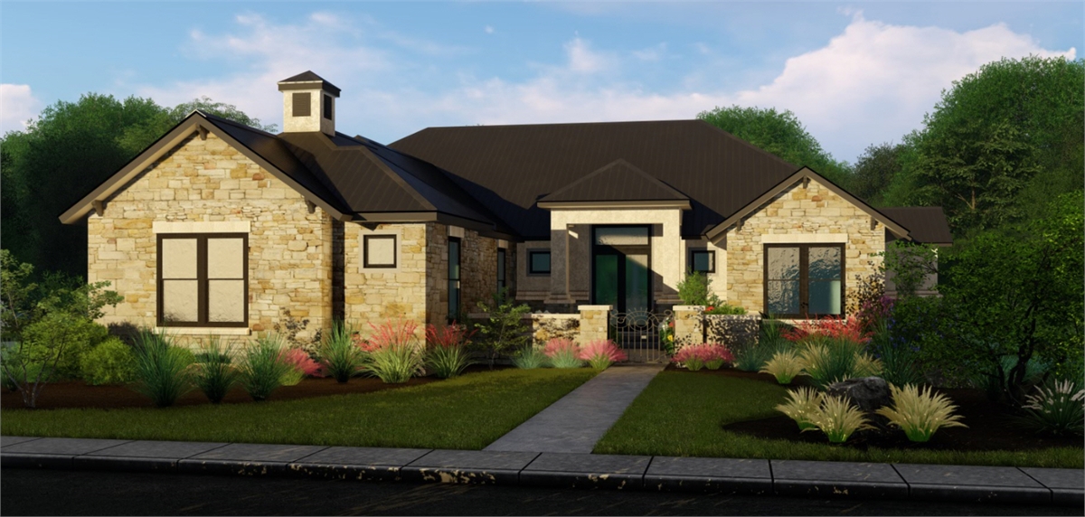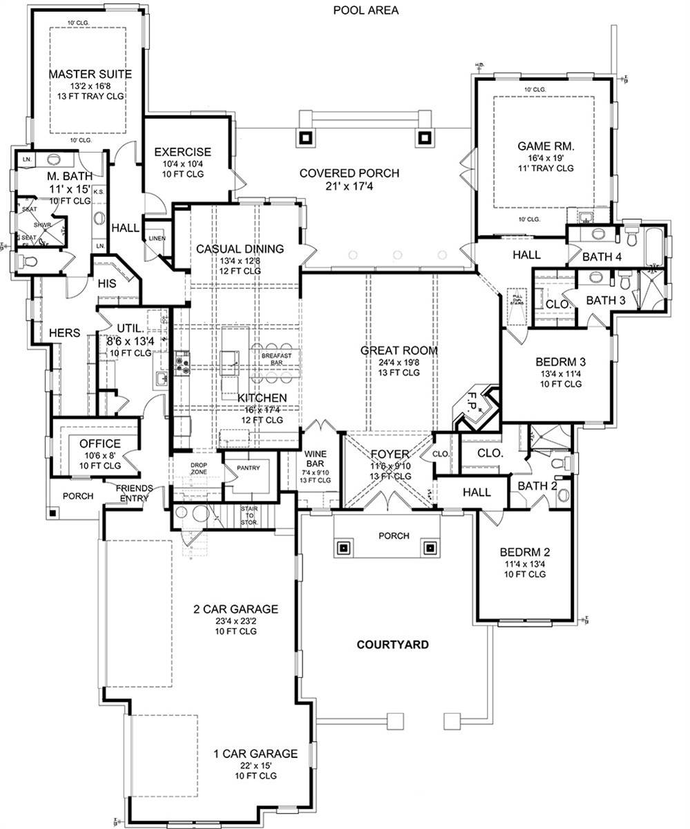 This traditional one-story house plan with three bedrooms and four baths offers plenty of curb appeal in its 3,181 square feet of living area. You'll want to invite friends over to your home plan, to see your fantastic great room with a corner fireplace. The island kitchen includes a nearby pantry and wine bar. The casual dining room is perfect for any meal. Relax in the peaceful master suite, where the private bath showcases a sit-down shower and dual vanities. Walk-in closets and personal baths are fabulous features in the secondary bedrooms of this home design. Builders point out the front courtyard and rear porch, as well as the exercise room, game room and cozy office.