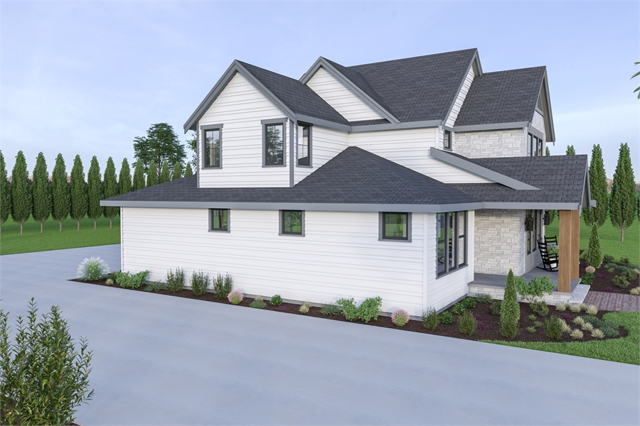 You will love the number of windows that grace the front of this beautiful 3,275 square foot 2-story farmhouse plan with three outdoor living spaces. Take a peek inside and you’ll see all the sweet modern farmhouse vibes. Off the foyer is a private front office and powder room, then a wide open floor plan where the living room, L-shaped kitchen and dining room enjoy the fireplace and wall of windows. Conveniently located behind the kitchen is the laundry room, mud room and casual family room.  The first floor plan also features the master suite, which is complete with double bowl vanity and walk-in closet. The second floor features three bedrooms and one full bath and some flexible space for the children.