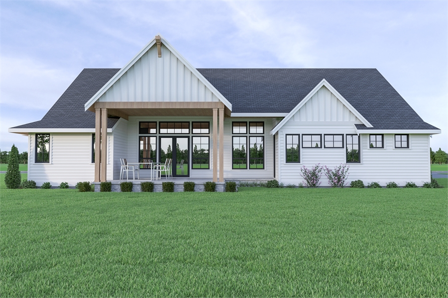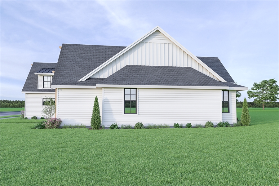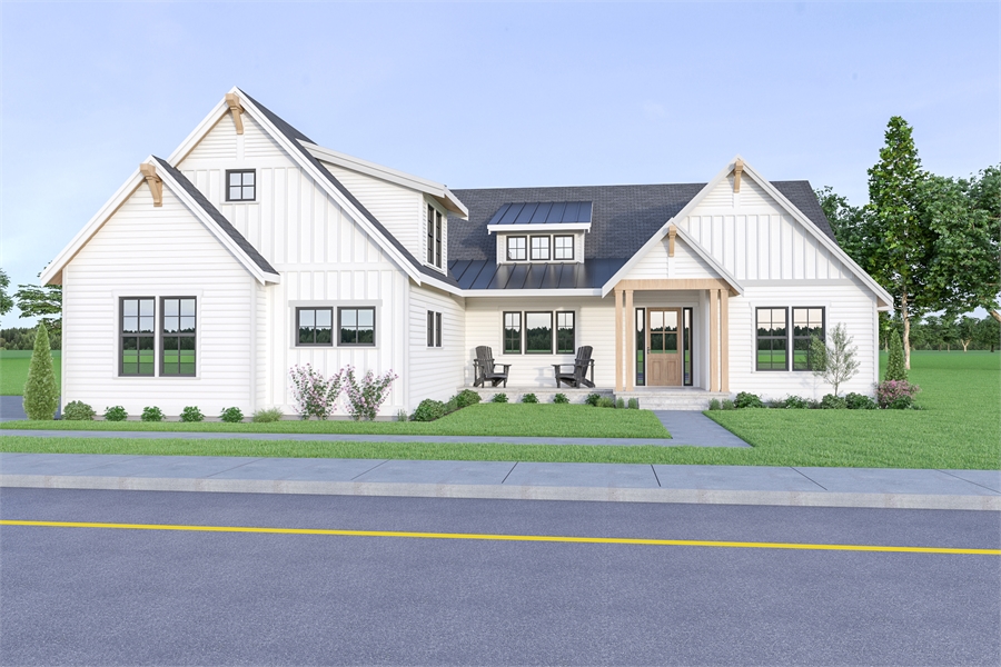 A contemporary take on the classic farmhouse style plan, this 1.5 story home is as spacious as it is charming. Great for an open lot, this design provides a comfortable 2,948 square feet, along with 3 large beds, 3.5 baths, and even an attached 2-car garage. You'll love the gorgeous facade which is adorned in simple stylings such as the large windows and exposed wood beams. Inside, discover an open layout, including the gourmet island kitchen, dining room, and great room which opens on to the covered patio. The master is relaxingly spacious, including its en-suite and walk-in closet. A bonus room is located over the garage.