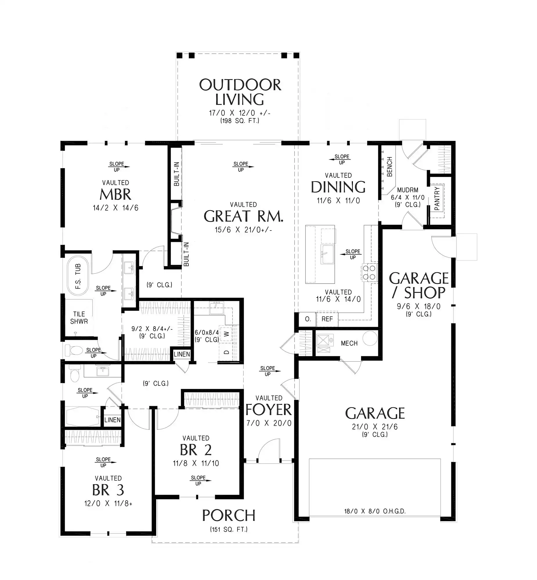 The Crestwood Contemporary house plan delivers sleek design with modern ranch appeal. At 2,085 square feet, this single-story layout offers 3 bedrooms, 2 bathrooms, and an open floor plan that maximizes natural light. A vaulted great room anchors the home with direct flow to the dining area and kitchen, where a large island and pantry add function. The primary suite includes a walk-in closet, double vanities, and a spa-inspired bath with separate tub and shower. Two additional bedrooms share a full bath, making it ideal for families or guests. A two-car garage with a dedicated workshop space provides storage and flexibility. Covered front and rear porches extend living outdoors, making this home as stylish as it is practical.