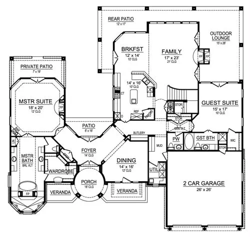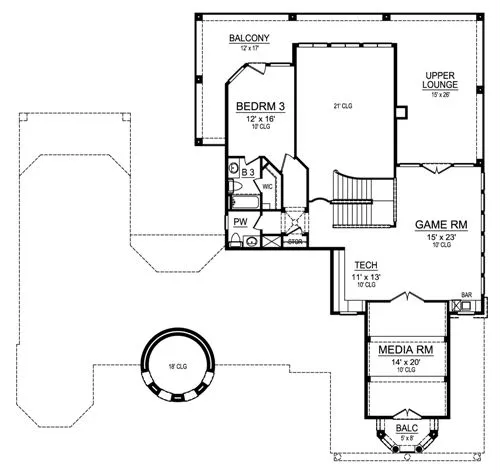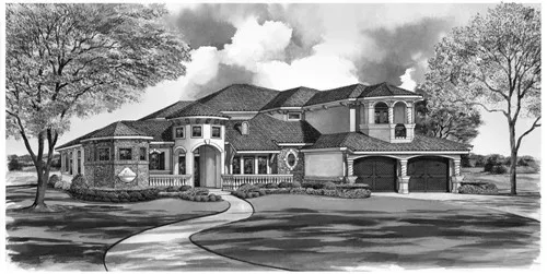 Arches, stucco and a tile roof give this beautiful two-story house plan a magical Mediterranean appeal. A circular porch opens to a V-shaped foyer and a patio beyond. The unique dining room is pleasant and refined. The island kitchen includes a handy pantry. The breakfast nook opens to a patio that wraps around to an outdoor lounge. The versatile family room hosts any gathering in comfort. A short hallway with a groin-vaulted ceiling leads to a charming guest suite. The master suite's amazing sleeping chamber boasts a fireplace, a wet bar and French doors to a private patio. The personal bath is almost shocking, with its oval tub, fireplace and sprawling shower. Upstairs, you could amuse yourself (and your friends) for hours with the game room, tech area, media room and balconies. A third bedroom flaunts a private bath. Did you notice that this home has four fireplaces?