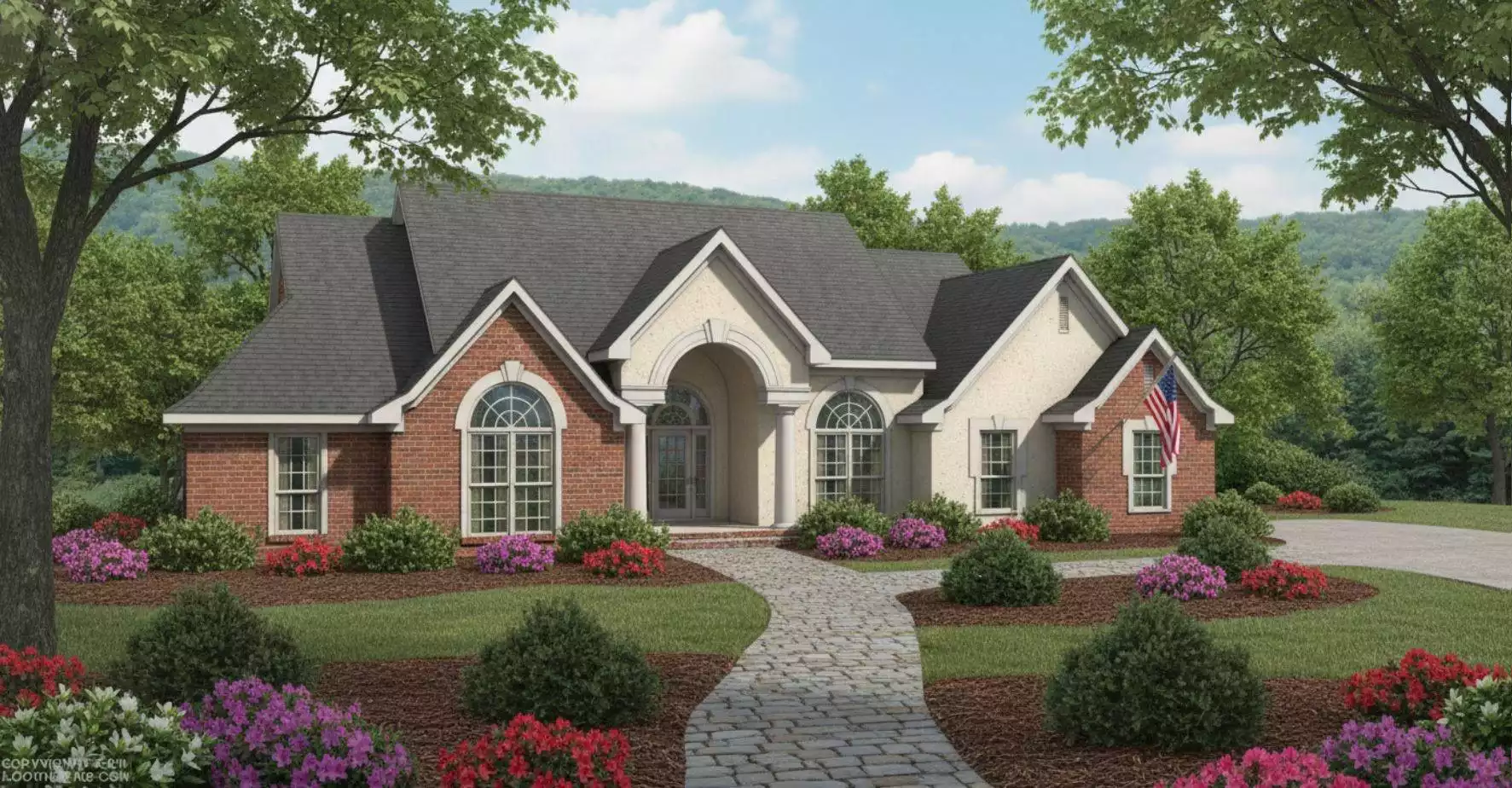 A gabled stucco entry with oversized columns emphasizes the arched glass entry of this traditional brick home. The home includes a large Kitchen/Family Room with an octagonal shaped Breakfast area. The Master Bedroom features a cathedral ceiling and your attention centers immediately on the columned and arched entry to the spacious Master Bath.