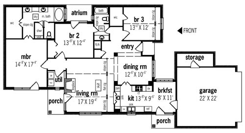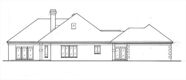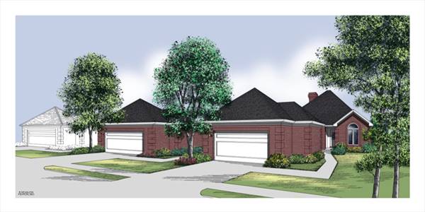 The front loading garage and the narrow width make this a perfect home for narrow lots. There are no windows on the right exterior wall so this plan can also be used for “zero” lot line situations. The well designed kitchen is conveniently located between the two dining areas and there is a full size pantry and pass-thru to the living room. The living room features volume ceilings with a skylight, brick wood burning fireplace and French door access to the rear covered porch. The master suite has garden door access to the rear lawn area and a luxury bath that features sloped ceilings with skylights, giant walk-in closet, soaking tub with atrium view, twin vanities, separate shower and a private toilet area. The large secondary bed rooms share a well appointed bath.