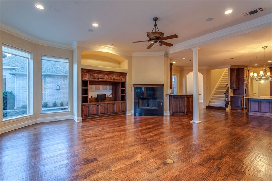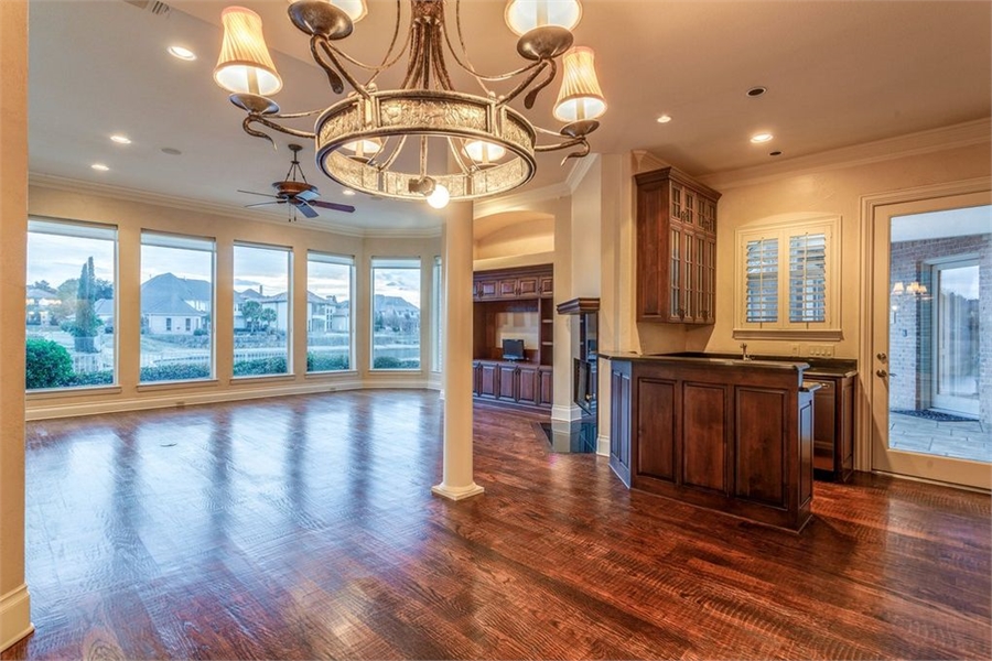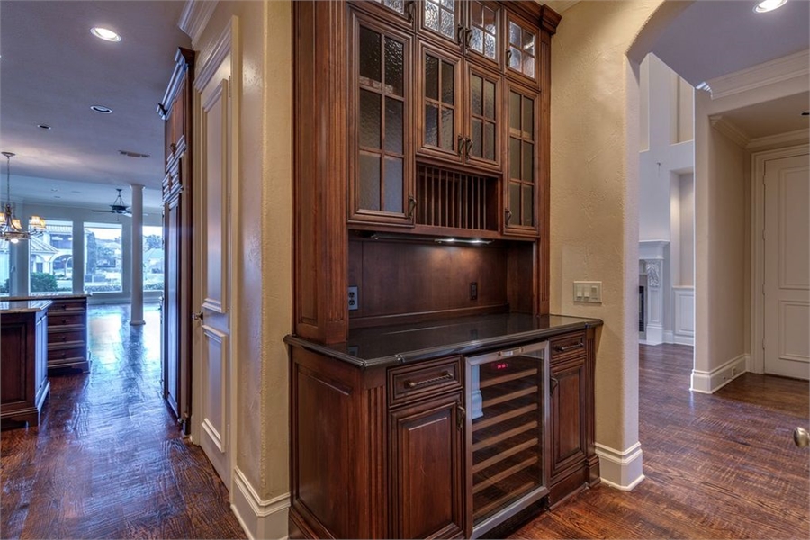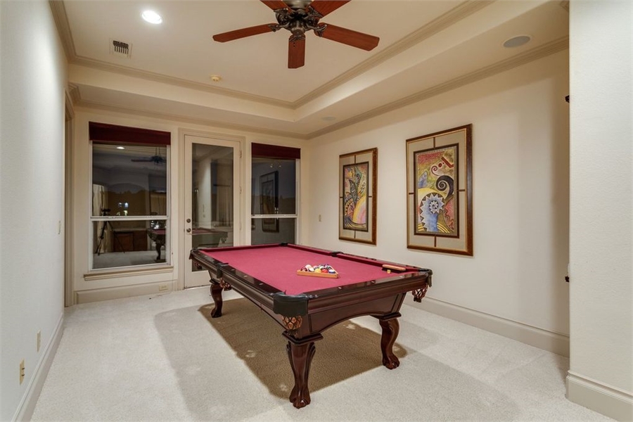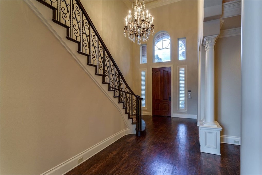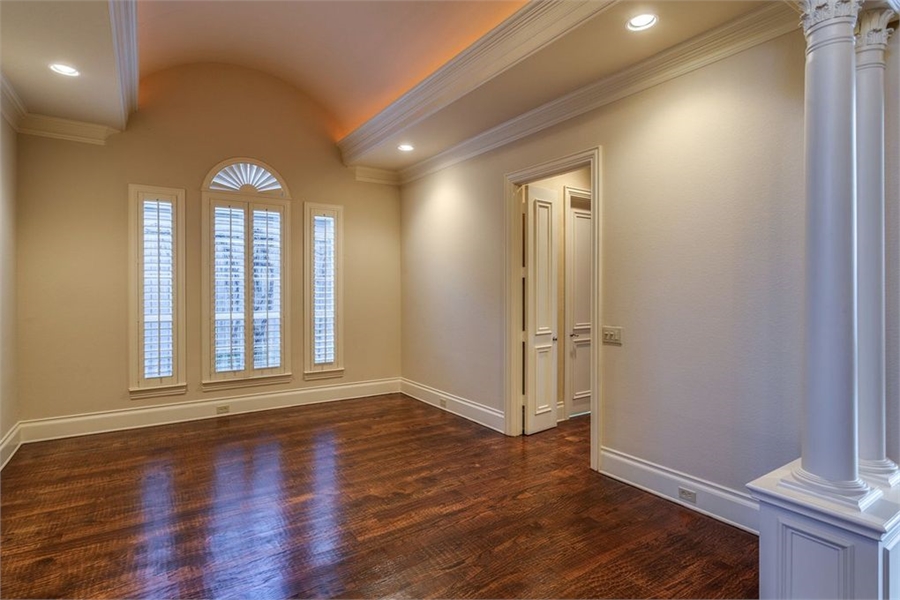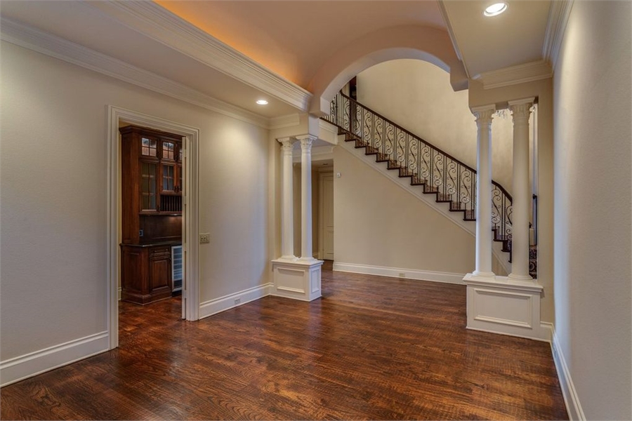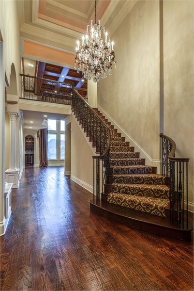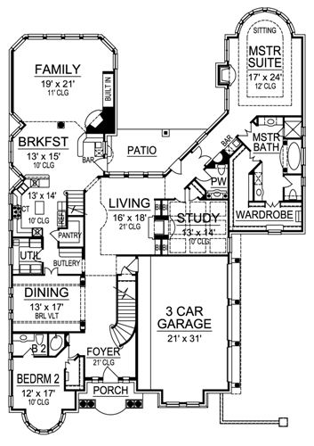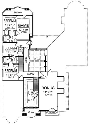 This French-inspired luxury mansion is a wonderful home for any family. The 24-ft. vaulted foyer offers a sweeping staircase and entrance to a family bedroom that could be easily converted into a guest room or in-law suite. The bedroom has a bayed sitting area, walk-in closet and private bath. From the foyer, enter the elegant dining room, with its barrel vaulted ceiling and entrance to the butlery, utility room and kitchen for ease in serving. The breakfast room and family room are separated by a large decorative pillar, allowing the warmth of the family room's fireplace to be enjoyed in the breakfast area and kitchen. The family room offers built-ins and a large bank of windows along the back of the room. A bar and patio access from the breakfast room make entertaining convenient to the gathering area. The study features a coffered ceiling and opens to the living room. The luxurious master suite boasts a bayed sitting area, a tray ceiling, a fireplace, and a lavish master bath with his and hers vanities, separate shower and tub, and large wardrobe. The winding stairs lead to a loggia with views of the main level. There are three family bedrooms upstairs, two sharing a Jack and Jill bath and the other with a full bath and access to the balcony and game room. A bar and bonus room complete this level of this luxury mansion home plan.