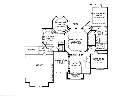 Old world ambiance characterizes this European styled home. The elegant stone entrance opens to the two story Foyer. A well proportioned Dining Room is viewed through an arch flanked by columns. The oversized Great Room features a coffered ceiling and a see through fireplace that can be seen from the Kitchen, Breakfast Room and Great Room. The Master Suite includes a luxury Bath and a cozy sitting area off the Bedroom. A second Bedroom downstairs acts as Nursery, Guest Room or Study. Upstairs, two roomy Bedrooms share a Bath. An expandable area is available for future use.