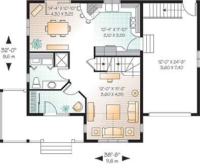 This tidy home is equally enchanting in the country or the city. The repeating angles of gables and double-sloped roofline are interrupted by the change of angle over the L-shaped porch. The generous foyer includes a seating area. Every inch of the living area is efficiently used. Guests will enjoy the forward living room and kids will love spying over the stair rails. At the rear of the house, cook up a storm and serve at the eating bar or adjoining dining area. A discreet shower room with laundry closet completes the main level. Upstairs, the master bedroom includes a walk-in closet and shares a family bathroom with two secondary bedrooms. The attached garage opens conveniently to the kitchen and also includes a staircase to the basement.