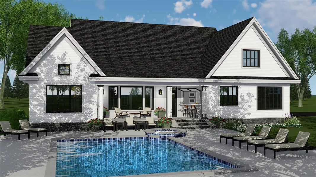 The ornate accent finishes and the large open layout and sloping roof makes this house plan the perfect hybrid of a craftsman and a farmhouse style. Complete with 2,751 square feet as well as 4 bedrooms and 3.5 bathrooms, this plan has plenty of space as well of plenty of practicality. The sizable front porch is perfect for an afternoon spent outside with a good book or a cold drink on a summer’s day, while the large windows of the home offer plenty of light in to the building. The unique island of the kitchen and its seating areas make family dinners or breakfasts before work, easily attainable. One of the best parts of the plan is the versatile rear porch and seating areas which lend themselves perfectly to the addition of a pool, adding a whole new element to outdoor living. The second floor also offers 2 bedrooms as well as a loft that is great for a TV area or game space